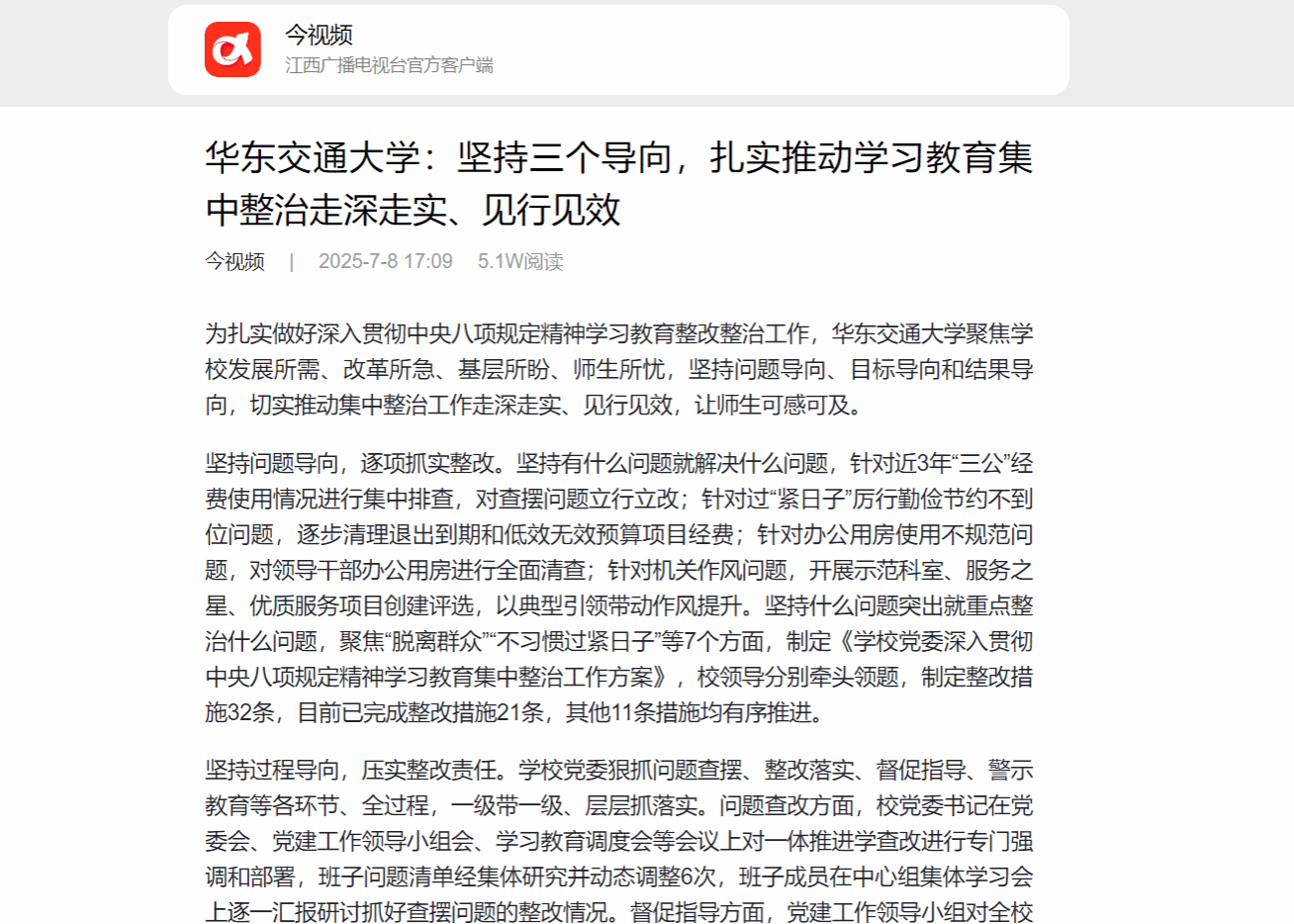 坚持过程导向,压实整改责任。学校党委狠抓问题查摆、整改落实、督促指导、警示教育等各环节、全过程,一级带一级、层层抓落实。问题查改方面,校党委书记在党委会、党建工作领导小组会、学习教育调度会等会议上对一体推进学查改进行专门强调和部署,班子问题清单经集体研究并动态调整6次,班子成员在中心组集体学习会上逐一汇报研讨抓好查摆问题的整改情况。督促指导方面,党建工作领导小组对全校48个处级班子集中整治工作调度3次、联审1次、督导1次,在二级党组织书记会上对督导发现的问题进行通报。警示教育方面,召开正风肃纪警示教育会,通报校内外违反中央八项规定精神典型案例6个并作剖析警示;对校内作风不实问题情况给予全校通报批评;梳理并发布《公文处理错情通报》1期;对办公用房用电浪费、课堂教学等情况进行检查和通报5次。