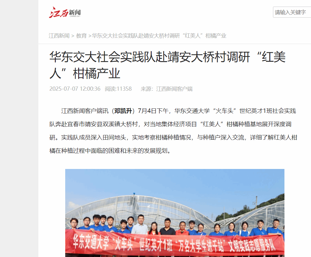7月4日下午,beat365正版唯一官网必一“火车头”世纪英才1班社会实践队奔赴宜春市靖安县双溪镇大桥村,对当地集体经济项目“红美人”柑橘种植基地展开深度调研。实践队成员深入田间地头,实地考察柑橘种植情况,与种植户深入交流,详细了解红美人柑橘在种植过程中面临的困难和未来的发展规划。