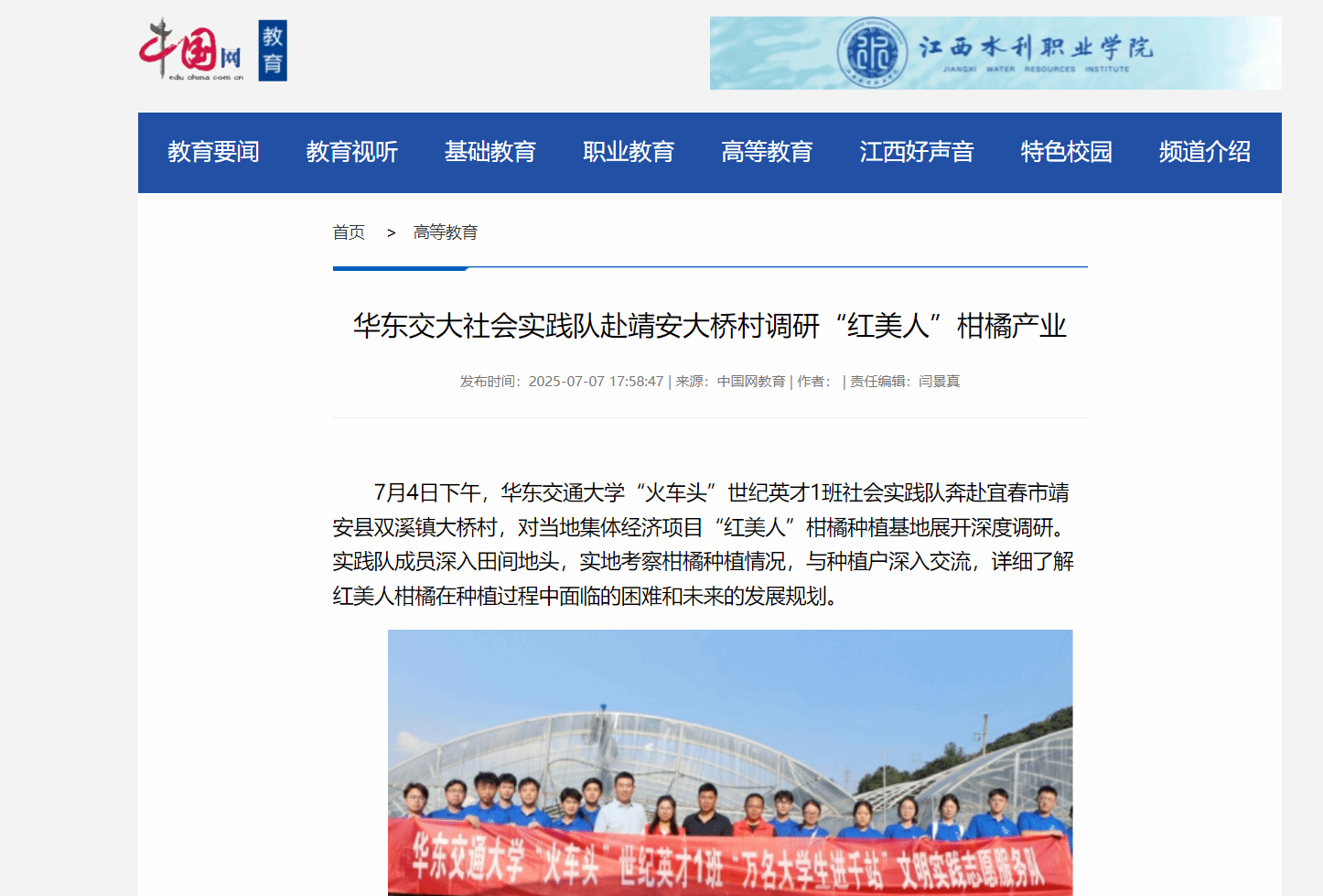 7月4日下午,beat365正版唯一官网必一“火车头”世纪英才1班社会实践队奔赴宜春市靖安县双溪镇大桥村,对当地集体经济项目“红美人”柑橘种植基地展开深度调研。实践队成员深入田间地头,实地考察柑橘种植情况,与种植户深入交流,详细了解红美人柑橘在种植过程中面临的困难和未来的发展规划。