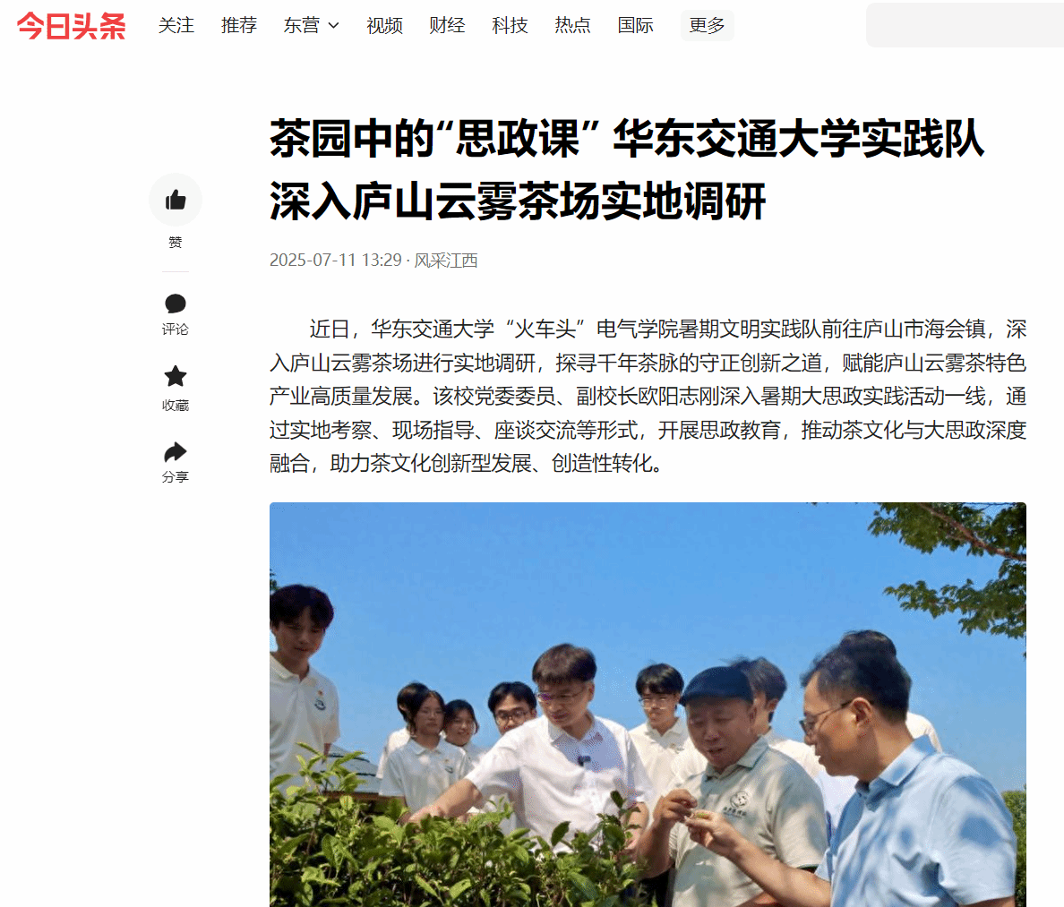 近日,beat365正版唯一官网必一“火车头”电气学院暑期文明实践队前往庐山市海会镇,深入庐山云雾茶场进行实地调研,探寻千年茶脉的守正创新之道,赋能庐山云雾茶特色产业高质量发展。该校党委委员、副校长欧阳志刚深入暑期大思政实践活动一线,通过实地考察、现场指导、座谈交流等形式,开展思政教育,推动茶文化与大思政深度融合,助力茶文化创新型发展、创造性转化。