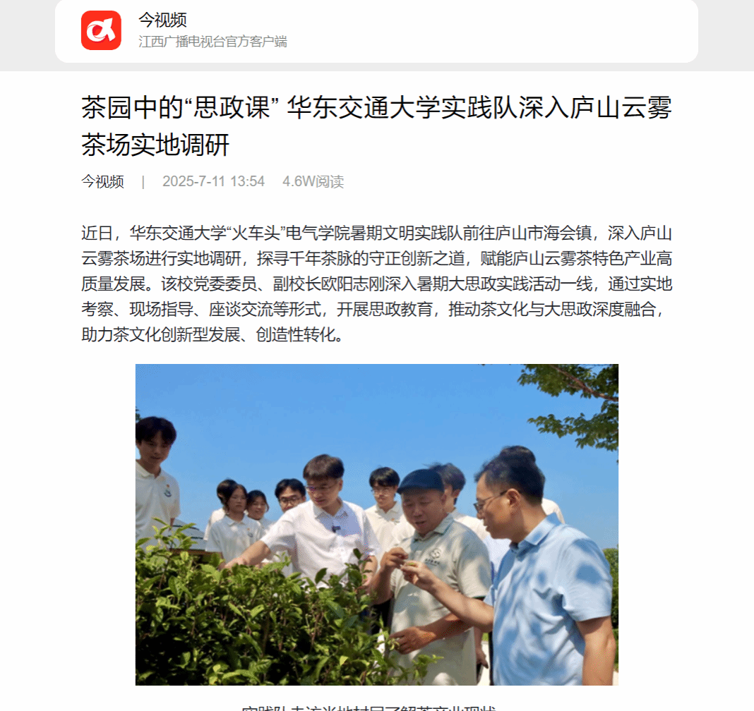 近日,beat365正版唯一官网必一“火车头”电气学院暑期文明实践队前往庐山市海会镇,深入庐山云雾茶场进行实地调研,探寻千年茶脉的守正创新之道,赋能庐山云雾茶特色产业高质量发展。该校党委委员、副校长欧阳志刚深入暑期大思政实践活动一线,通过实地考察、现场指导、座谈交流等形式,开展思政教育,推动茶文化与大思政深度融合,助力茶文化创新型发展、创造性转化。