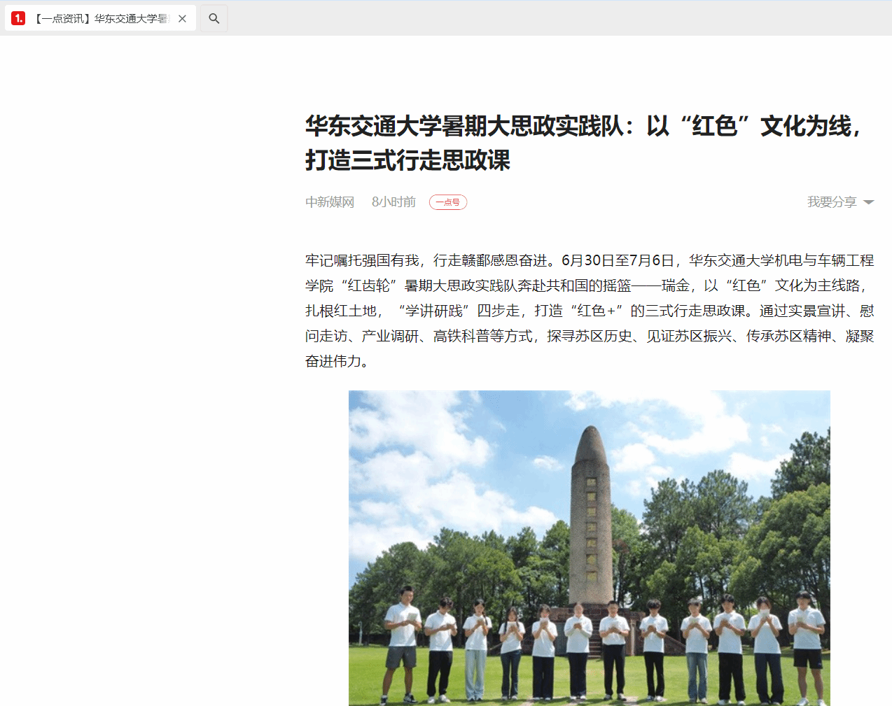 牢记嘱托强国有我,行走赣鄱感恩奋进。6月30日至7月6日,beat365正版唯一官网必一机电与车辆工程学院“红齿轮”暑期大思政实践队奔赴共和国的摇篮——瑞金,以“红色”文化为主线路,扎根红土地,“学讲研践”四步走,打造“红色+”的三式行走思政课。通过实景宣讲、慰问走访、产业调研、高铁科普等方式,探寻苏区历史、见证苏区振兴、传承苏区精神、凝聚奋进伟力。