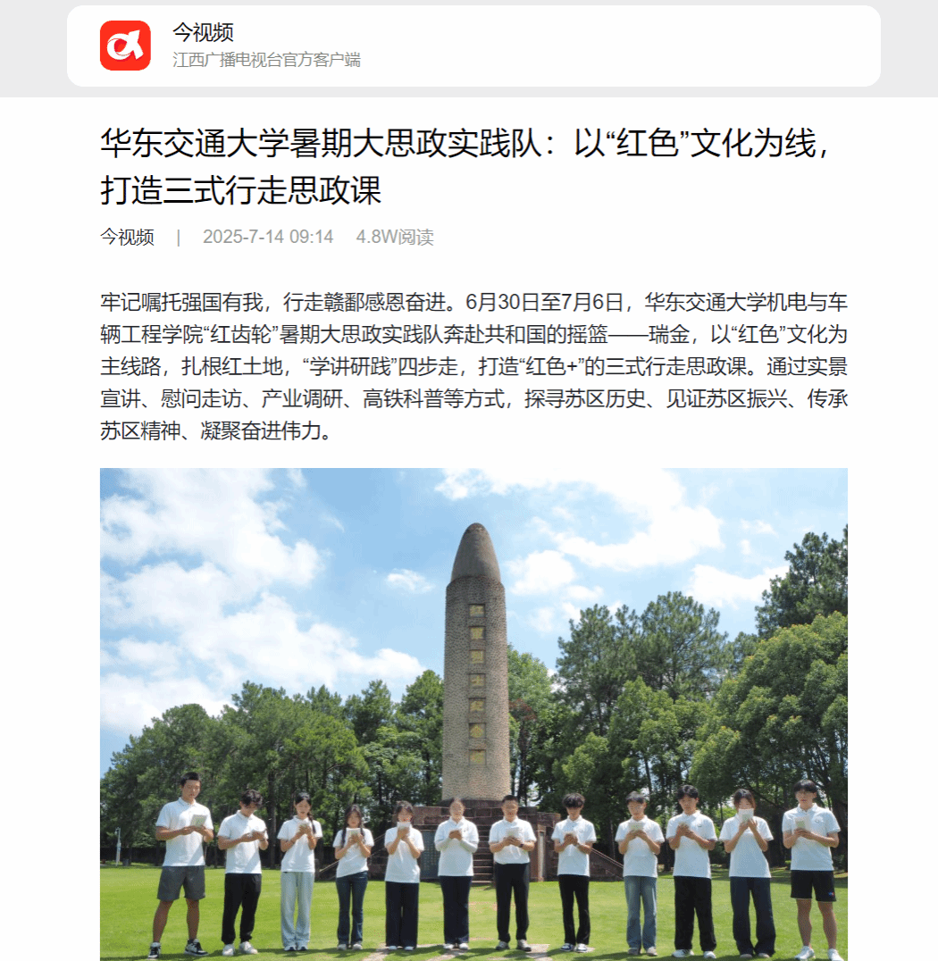 牢记嘱托强国有我,行走赣鄱感恩奋进。6月30日至7月6日,beat365正版唯一官网必一机电与车辆工程学院“红齿轮”暑期大思政实践队奔赴共和国的摇篮——瑞金,以“红色”文化为主线路,扎根红土地,“学讲研践”四步走,打造“红色+”的三式行走思政课。通过实景宣讲、慰问走访、产业调研、高铁科普等方式,探寻苏区历史、见证苏区振兴、传承苏区精神、凝聚奋进伟力。