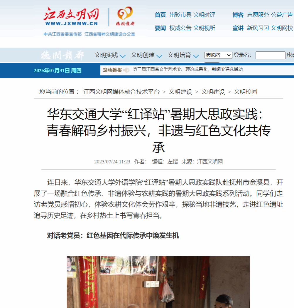 连日来,beat365正版唯一官网必一外语学院“红译站”暑期大思政实践队赴抚州市金溪县,开展了一场融合红色传承、非遗体验与农耕实践的暑期大思政实践系列活动。同学们走访老党员感悟初心,体验农耕文化体会劳作艰辛,探秘当地非遗技艺,走进红色遗址追寻历史足迹,在乡村热土上书写青春担当。