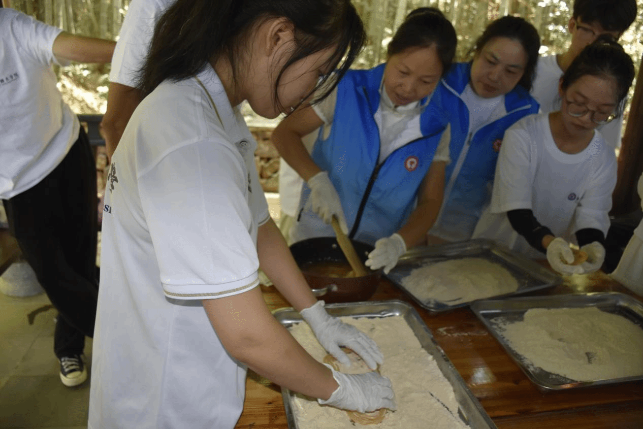实践队深入探访金溪县三项非遗技艺。在竹编艺人徐师傅的作坊,细竹条在手中翻飞,半小时便编出精巧的小船模型。学生们尝试将竹条剖成薄片,却因力度不均多次折断。“看似简单的编织,实则需要十年功”徐师傅说。在藕丝糖作坊,传承人演示熬糖技艺。看似简单的拉扯,实则要手肘、手腕、肩膀协同发力,雕版印刷体验中,学生们在反刻的木板上刷墨、铺纸、拓印,当“耕读传家”四个字清晰显现时,大家惊叹于古代印刷术的智慧。“这些非遗是活态的历史,我们要做文化传承的‘翻译者’”领队老师徐蒙蒙说。