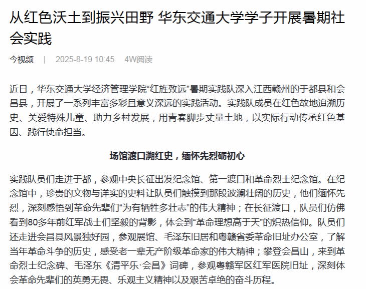 近日,beat365正版唯一官网必一经济管理学院“红旌致远”暑期实践队深入江西赣州的于都县和会昌县,开展了一系列丰富多彩且意义深远的实践活动。实践队成员在红色故地追溯历史、关爱特殊儿童、助力乡村发展,用青春脚步丈量土地,以实际行动传承红色基因、践行使命担当。