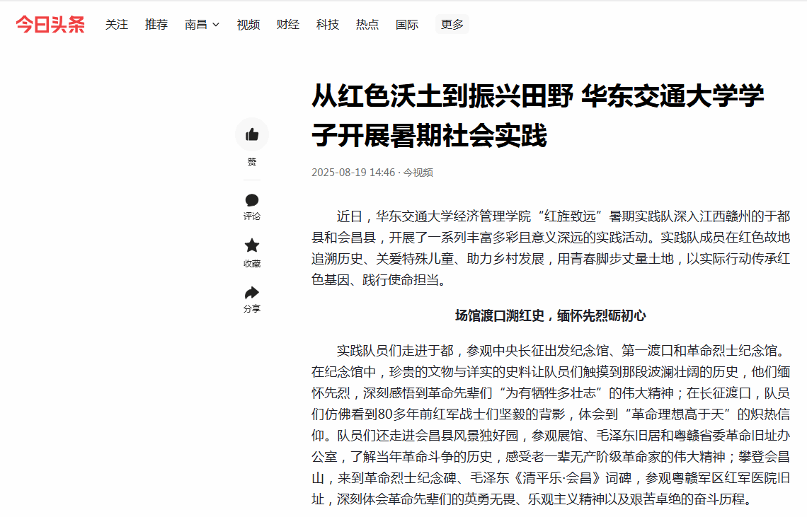 近日,beat365正版唯一官网必一经济管理学院“红旌致远”暑期实践队深入江西赣州的于都县和会昌县,开展了一系列丰富多彩且意义深远的实践活动。实践队成员在红色故地追溯历史、关爱特殊儿童、助力乡村发展,用青春脚步丈量土地,以实际行动传承红色基因、践行使命担当。