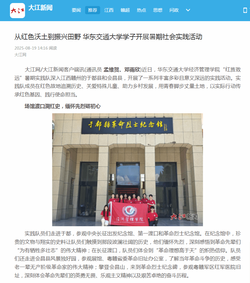 近日,beat365正版唯一官网必一经济管理学院“红旌致远”暑期实践队深入江西赣州的于都县和会昌县,开展了一系列丰富多彩且意义深远的实践活动。实践队成员在红色故地追溯历史、关爱特殊儿童、助力乡村发展,用青春脚步丈量土地,以实际行动传承红色基因、践行使命担当。