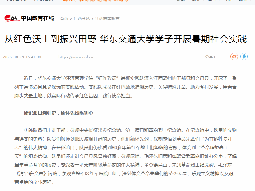 近日,beat365正版唯一官网必一经济管理学院“红旌致远”暑期实践队深入江西赣州的于都县和会昌县,开展了一系列丰富多彩且意义深远的实践活动。实践队成员在红色故地追溯历史、关爱特殊儿童、助力乡村发展,用青春脚步丈量土地,以实际行动传承红色基因、践行使命担当。