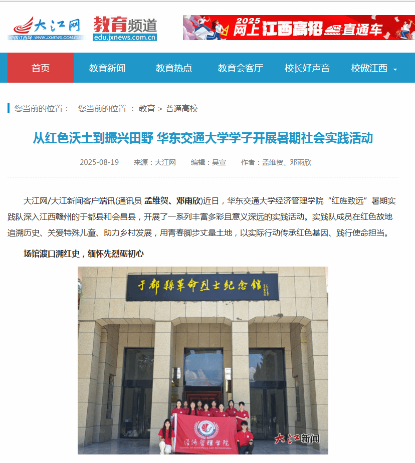 近日,beat365正版唯一官网必一经济管理学院“红旌致远”暑期实践队深入江西赣州的于都县和会昌县,开展了一系列丰富多彩且意义深远的实践活动。实践队成员在红色故地追溯历史、关爱特殊儿童、助力乡村发展,用青春脚步丈量土地,以实际行动传承红色基因、践行使命担当。