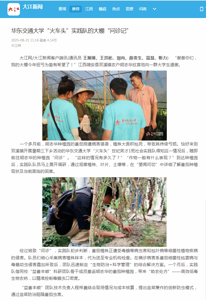 从校园到大棚,从书本到实践,这场持续一个月的“问诊”,不仅帮农户解决了实际问题,更生动诠释了知识的力量。未来,实践队将继续发挥桥梁纽带作用,畅通诉求反映通道,第一时间将调研实情与农民心声向上传递,凝聚社会合力纾解难题,以务实行动回应乡亲们的“急难愁盼”,为绘就乡村全面振兴壮美画卷贡献青春智慧和力量。