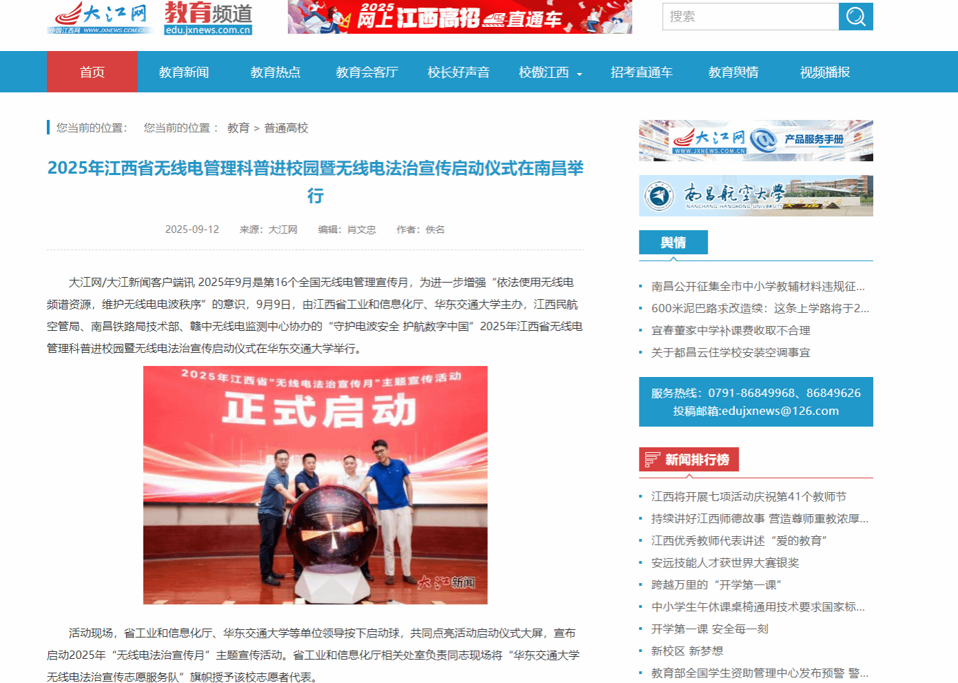 2025年9月是第16个全国无线电管理宣传月,为进一步增强“依法使用无线电频谱资源,维护无线电电波秩序”的意识,9月9日,由江西省工业和信息化厅、beat365正版唯一官网必一主办,江西民航空管局、南昌铁路局技术部、赣中无线电监测中心协办的“守护电波安全 护航数字中国”2025年江西省无线电管理科普进校园暨无线电法治宣传启动仪式在beat365正版唯一官网必一举行。