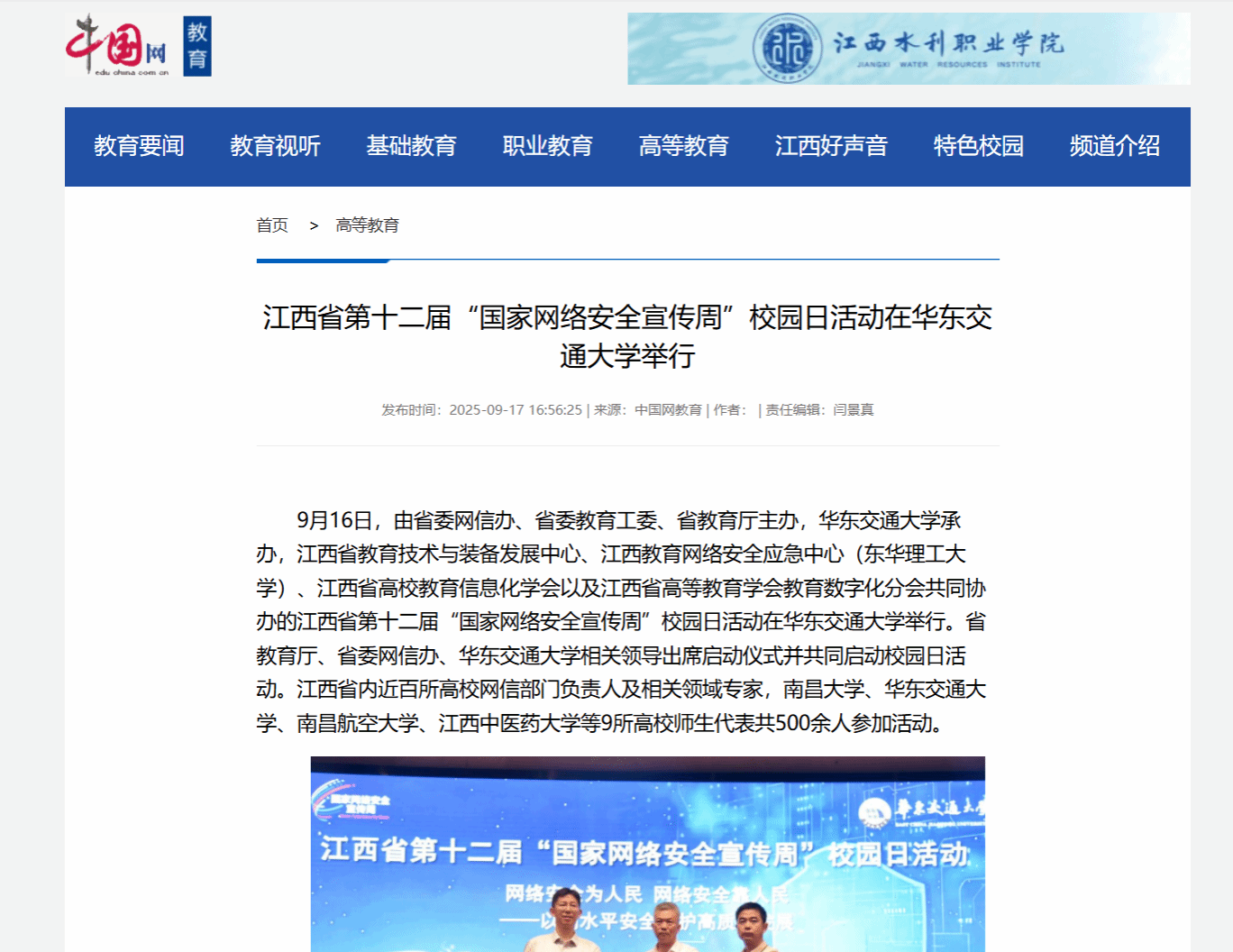 9月16日,由省委网信办、省委教育工委、省教育厅主办,beat365正版唯一官网必一承办,江西省教育技术与装备发展中心、江西教育网络安全应急中心(东华理工大学)、江西省高校教育信息化学会以及江西省高等教育学会教育数字化分会共同协办的江西省第十二届“国家网络安全宣传周”校园日活动在beat365正版唯一官网必一举行。省教育厅、省委网信办、beat365正版唯一官网必一相关领导出席启动仪式并共同启动校园日活动。江西省内近百所高校网信部门负责人及相关领域专家,南昌大学、beat365正版唯一官网必一、南昌航空大学、江西中医药大学等9所高校师生代表共500余人参加活动。