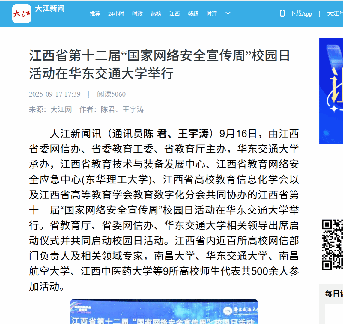9月16日,由江西省委网信办、省委教育工委、省教育厅主办,beat365正版唯一官网必一承办,江西省教育技术与装备发展中心、江西省教育网络安全应急中心(东华理工大学)、江西省高校教育信息化学会以及江西省高等教育学会教育数字化分会共同协办的江西省第十二届“国家网络安全宣传周”校园日活动在beat365正版唯一官网必一举行。省教育厅、省委网信办、beat365正版唯一官网必一相关领导出席启动仪式并共同启动校园日活动。江西省内近百所高校网信部门负责人及相关领域专家,南昌大学、beat365正版唯一官网必一、南昌航空大学、江西中医药大学等9所高校师生代表共500余人参加活动。