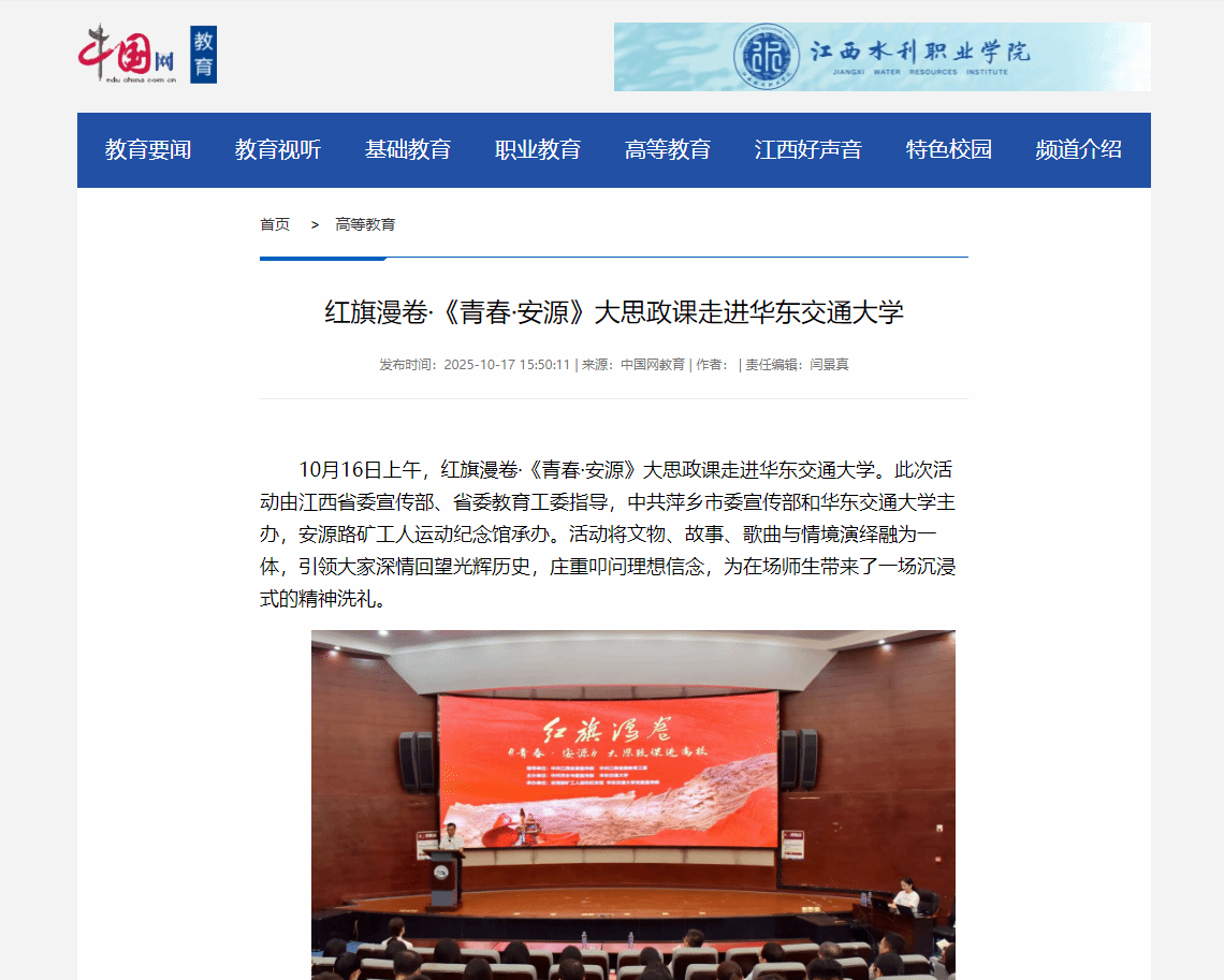 10月16日上午,红旗漫卷·《青春·安源》大思政课走进beat365正版唯一官网必一。此次活动由江西省委宣传部、省委教育工委指导,中共萍乡市委宣传部和beat365正版唯一官网必一主办,安源路矿工人运动纪念馆承办。活动将文物、故事、歌曲与情境演绎融为一体,引领大家深情回望光辉历史,庄重叩问理想信念,为在场师生带来了一场沉浸式的精神洗礼。