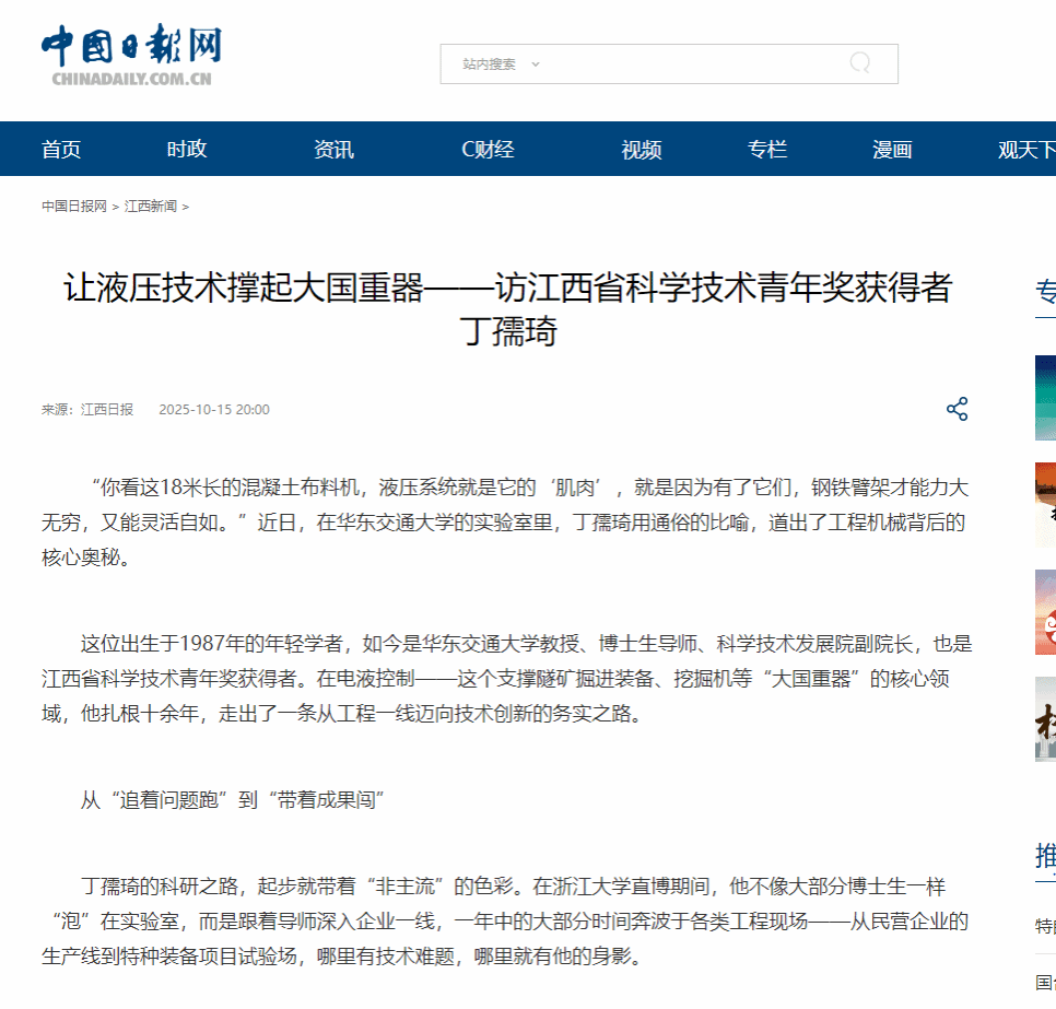 如今,丁孺琦的实验室里,液压系统仍在不知疲倦地运转。“搞科研,就要有围绕一个个小问题潜心研究的定力,要有‘关关难过、关关过’的毅力。”丁孺琦望着窗外的校园,语气坚定。