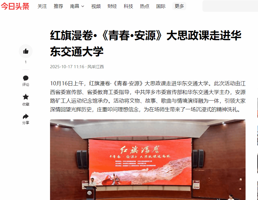 此次大思政课红旗漫卷·《青春·安源》走进高校,是安源路矿工人运动纪念馆拓展社会教育功能、推动红色文化育人的一次成功实践。它如同一次精神的火种播撒,让安源的星火在高校的青春沃土上焕发出新的光芒,有力地促进了红色血脉的赓续与传承。