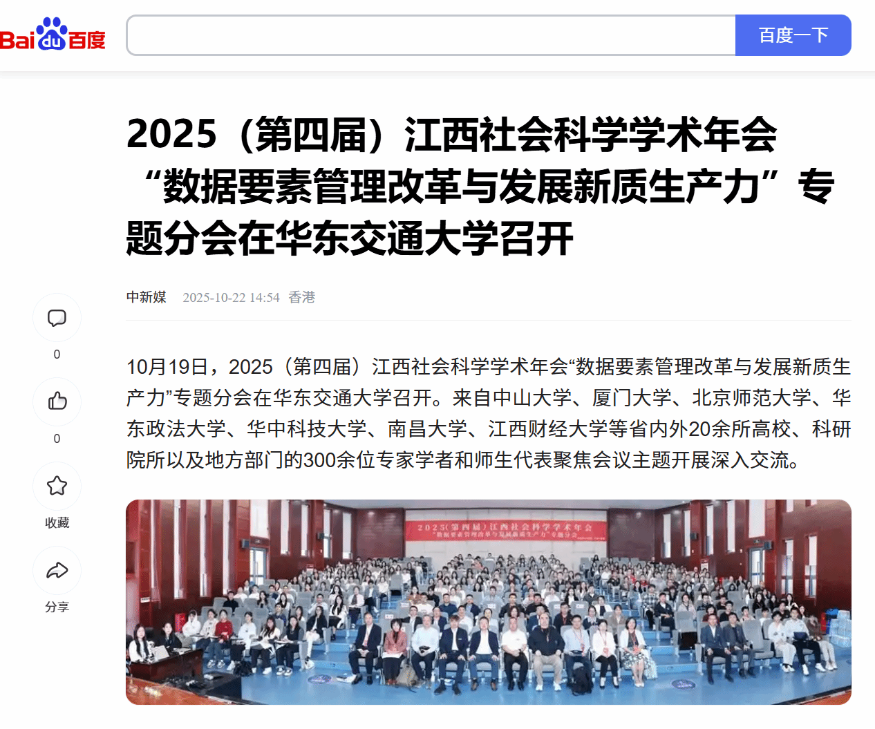 10月19日,2025(第四届)江西社会科学学术年会“数据要素管理改革与发展新质生产力”专题分会在beat365正版唯一官网必一召开。来自中山大学、厦门大学、北京师范大学、华东政法大学、华中科技大学、南昌大学、江西财经大学等省内外20余所高校、科研院所以及地方部门的300余位专家学者和师生代表聚焦会议主题开展深入交流。