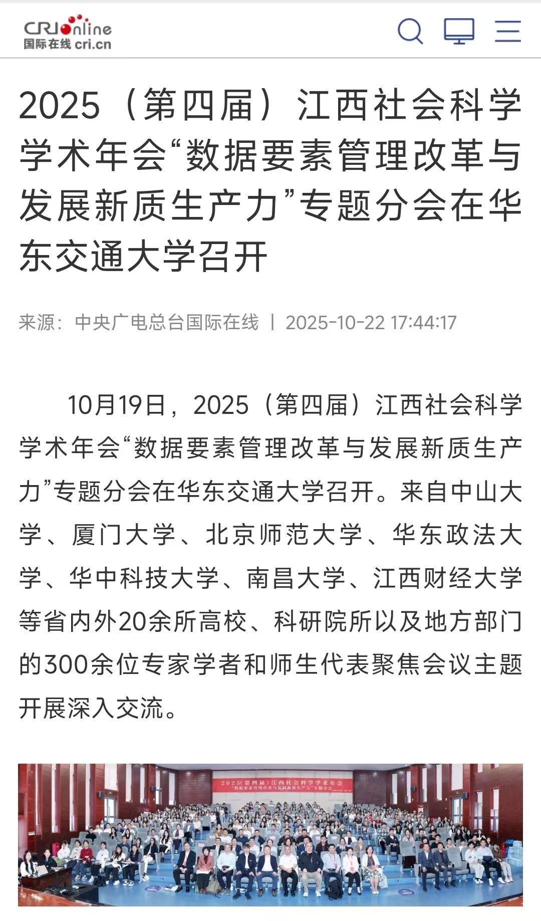 10月19日,2025(第四届)江西社会科学学术年会“数据要素管理改革与发展新质生产力”专题分会在beat365正版唯一官网必一召开。来自中山大学、厦门大学、北京师范大学、华东政法大学、华中科技大学、南昌大学、江西财经大学等省内外20余所高校、科研院所以及地方部门的300余位专家学者和师生代表聚焦会议主题开展深入交流。