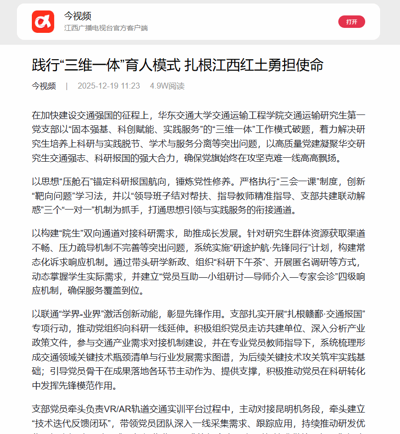 支部党员在今年取得2025年研究生数学建模大赛赛题全国第一名的历史性突破(江西省参赛历史最好成绩),在南昌西站“免安检”改造项目中牵头提出的优化方案获市政府采纳,在VR/AR教学平台研发中攻克技术瓶颈并推广至全国高校。党员累计完成横向课题近100项,合同经费超2000万元,支部获评校级首批研究生“样板党支部”和“先进基层党组织”,支部党员入选校级首批“党员标兵”和“党员标兵提名”,有力推动研究生学生党支部将党的建设与科研实践在深度、广度和实效上深度融合。