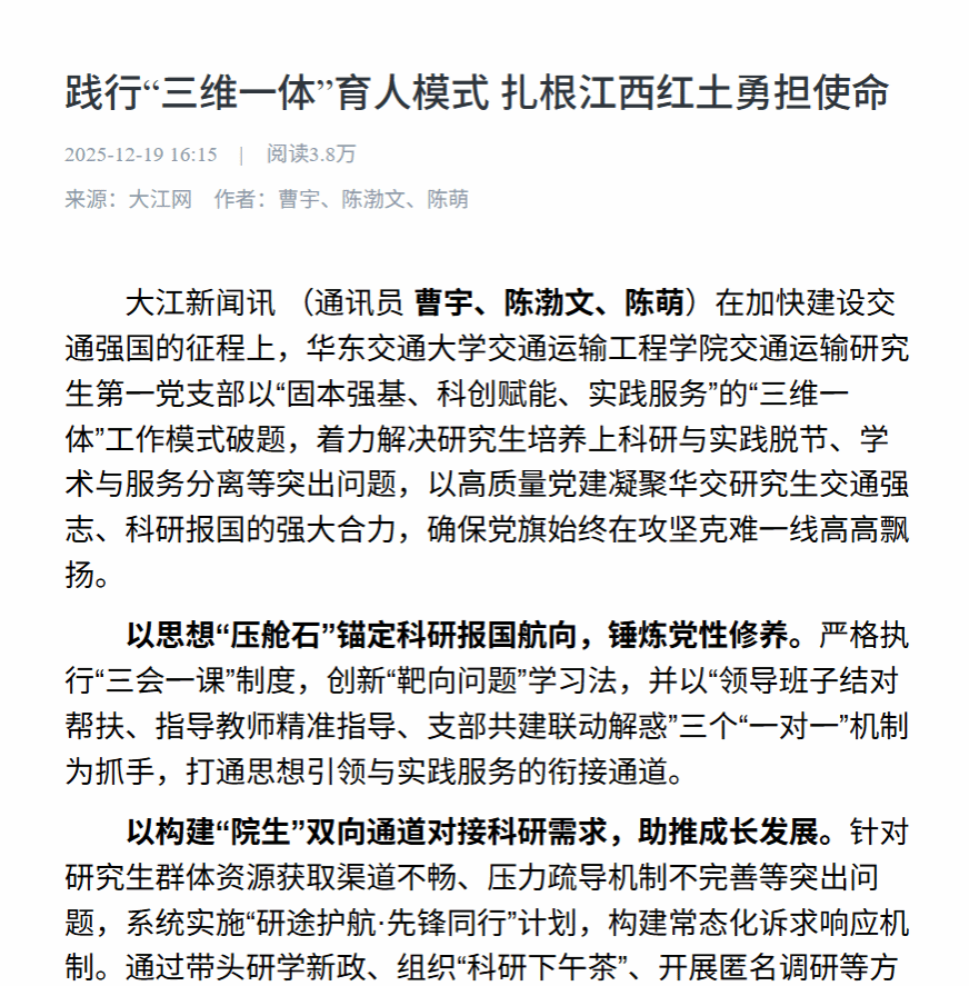 支部党员在今年取得2025年研究生数学建模大赛赛题全国第一名的历史性突破(江西省参赛历史最好成绩),在南昌西站“免安检”改造项目中牵头提出的优化方案获市政府采纳,在VR/AR教学平台研发中攻克技术瓶颈并推广至全国高校。党员累计完成横向课题近100项,合同经费超2000万元,交通运输研究生第一党支部获评校级首批研究生“样板党支部”和“先进基层党组织”,支部党员入选校级首批“党员标兵”和“党员标兵提名”,有力推动研究生学生党支部将党的建设与科研实践在深度、广度和实效上深度融合。