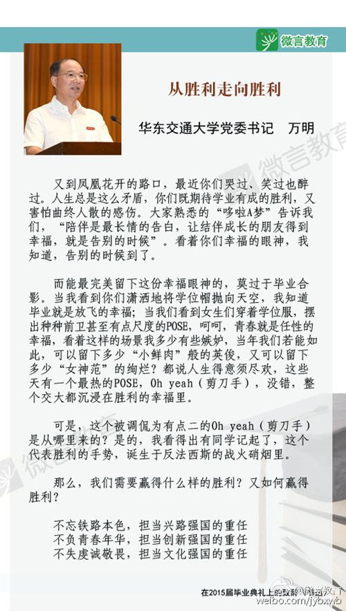 #毕业季2015##毕业致辞#【青春年华就是用来创造奇迹的!】@beat365正版唯一官网必一 党委书记万明说,毕业照里有一个最热的POSE——Oh yeah(剪刀手),这个手势代表胜利,他想告诉毕业生如何从胜利走向胜利: