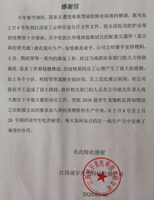 日前,机电学院收到来自江西诚宇光电科技有限公司的感谢信,信中表达了对2018级机电学子龙逸帆在2月8日至2月20日期间,加班加点、持续奋战在加紧生产防疫物资一线的衷心感谢。为打赢新冠肺炎疫情防控阻击战,江西诚宇...