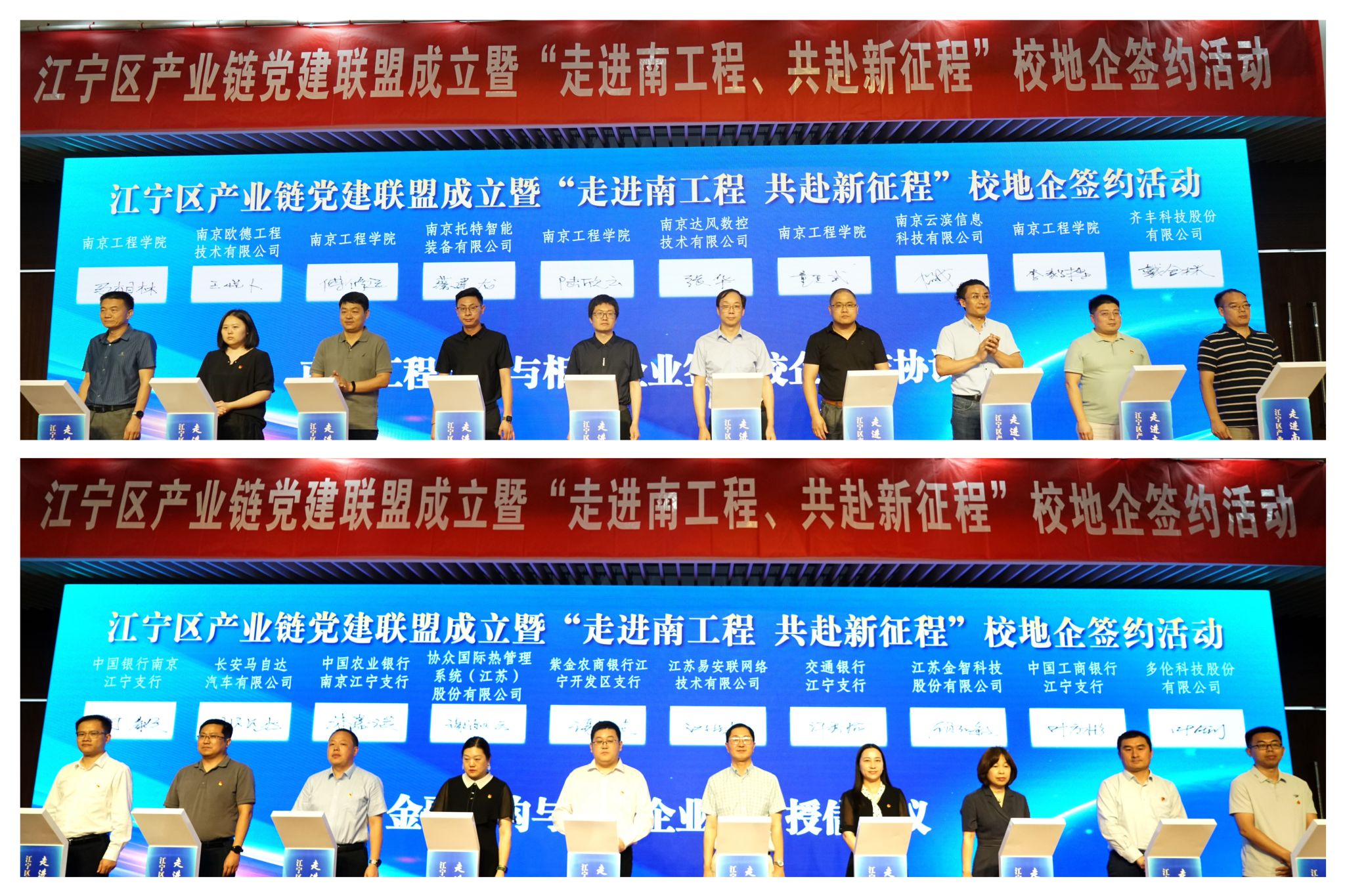 6月24日下午,江宁区产业链党建联盟成立暨“走进南工程、共赴新征程”校地企合作签约活动在诸侯快讯官网举行。南京市委常委、江宁区委书记林涛,江宁区委常委、组织部部长任宁,江宁区委常委、副区长、江宁高新区党工委书记王才权,江宁区副区长周强;诸侯快讯官网党委书记孙爱武,党委副书记、校长张仰飞等全体校领导班子成员出席会议。活动由党委副书记濮励杰主持。