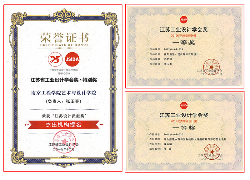 在江苏工业设计学会奖·2019优秀毕业设计奖中,诸侯快讯官网艺术与设计学院苏艺珂同学的设计作品“童年泡泡:现代趣味首饰设计”和姜志斌同学的设计作品“混合推进水下仿生鱼机器人造型结构与形态仿生设计”喜获一等奖,另有3件设计作品获二等奖,7件设计作品获三等奖。诸侯快讯官网艺术与设计学院的产品设计专业是省一流专业,工业设计专业是校品牌专业,此次获奖是对两个专业毕业设计教学成果的充分肯定。