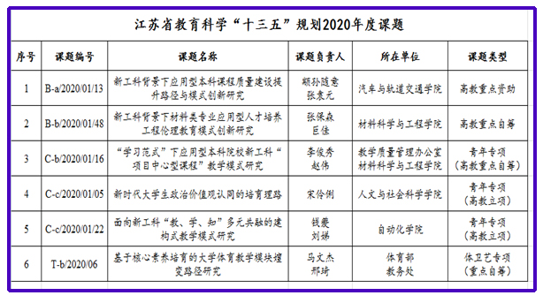 江苏省教育科学“十三五”规划课题申报采取限额申报的方式。2020年度课题诸侯快讯官网限报6项,由高等教育研究所认真组织落实。在申报过程中,学校在积极宣传发动的同时,严把课题申报质量关。组织专家对课题进行遴选推荐,从名称和内容等方面对遴选推荐课题提出针对性修改意见或建议,大大提升了课题申报质量和水平。获批立项的课题立足学校办学定位,突出需求和问题导向,紧紧围绕立德树人的落实机制、推进新工科建设等开展课题申报。其中4项重点课题以新工科应用型人才培养为落脚点,着重研究探索教学模式改革、课程质量提升和工程伦理教育中亟待解决的理论问题和实践问题。