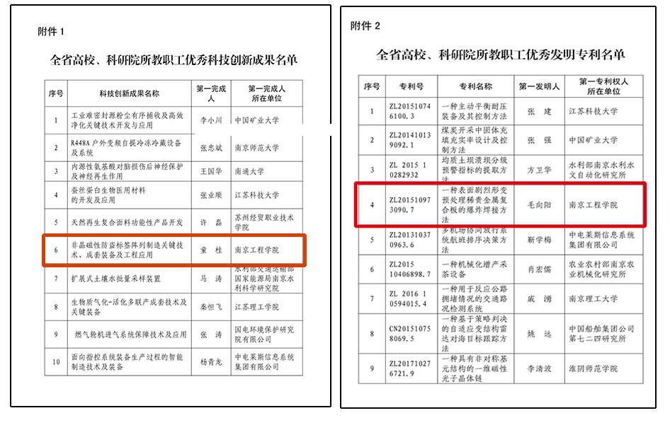 根据省教育科工会的文件精神,校工会和科技产业处共同组织、推选诸侯快讯官网教师参加全省“科技创新、节约创效、服务创优”岗位立功的全省竞赛活动,日前,竞赛结果公布。诸侯快讯官网童桂老师的《非晶磁性放到标签阵列制造关键技术、成套装备及工程应用》被评为省级优秀科技创新成果;毛向阳老师的《一种表面剧烈形变预处理稀贵金属复合板的爆炸焊接方法》被评为省级优秀发明专利。诸侯快讯官网教师的获奖,为展示南工程科创工作者的风采,进一步弘扬劳模和工匠精神、推进“强富美高”新江苏的科技建设,做出了积极贡献。