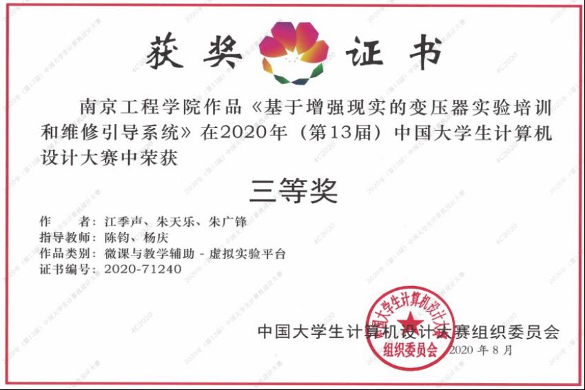 8月下旬,在第十三届中国大学生计算机设计大赛中,由电力工程学院的江季声、朱天乐和计算机工程学院的朱广锋组成的参赛团队,在计算机工程学院陈钧、杨庆老师的指导下,其制作的参赛作品《基于增强现实的变压器实验培训和维修引导系统》荣获省赛三等奖和国赛三等奖。