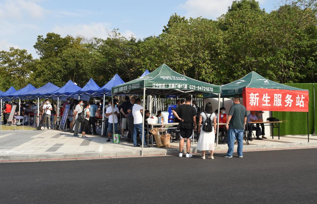 由学工队伍、保卫处、教务处、财务处、网络与信息中心、门诊部、后勤保障处等组成的工作人员有序迎接归家的学子。学校在火车站、火车南站、汽车站、小红山站、地铁站等均设立新生接待点;校门口,熟悉的“工程蓝”再次映入眼帘,一长排蓝色的遮阳棚,测体温区、APP扫码签到处、人工查验区、乘车点等蓝底白字的标志十分醒目;在教学楼东馆西馆报到点、大学生事务与发展中心和各学生公寓,工作人员一直在组织、协调各项迎新工作,他们的精心组织、周密安排,保证了新生报到和接待工作的顺利开展。
