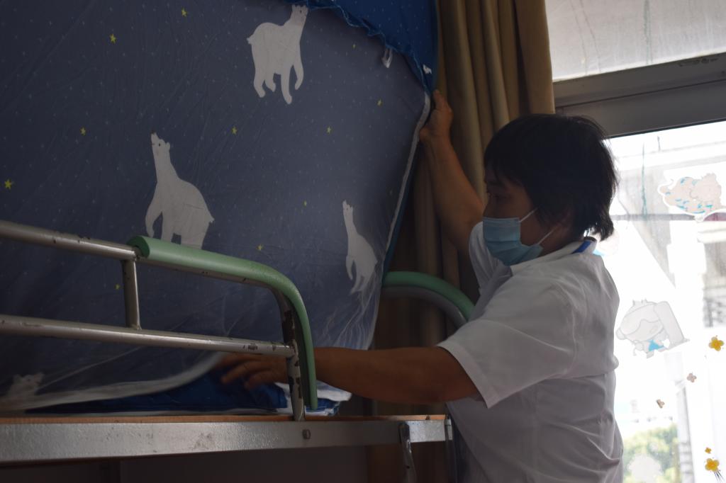 不能为孩子整理床铺,恐怕是最让家长“焦虑”的的事情了。没有了父母的依赖,各栋宿舍的阿姨主动担起了“父母”的角色,新生进入宿舍之后,挂蚊帐、套枕套、铺垫被……每一项阿姨都教得很有耐心,北区十幢许小萍阿姨一边忙碌一边说:“看到他们拎着行李进门,就像看到自己的孩子回家一样,他们住得舒心,我们也开心”。相比家长的不安和不舍,萌新的表现则很淡定,他们在阿姨们的帮助下,自己动手、出力流汗,实实在在体验了大学第一堂“劳动教育课”。个子高高的大一新生孙蜀阳说:“我们都是经历过特殊高考历练的人,哪有什么搞不定的,爸爸妈妈完全可以放心,我自己可以的!”
