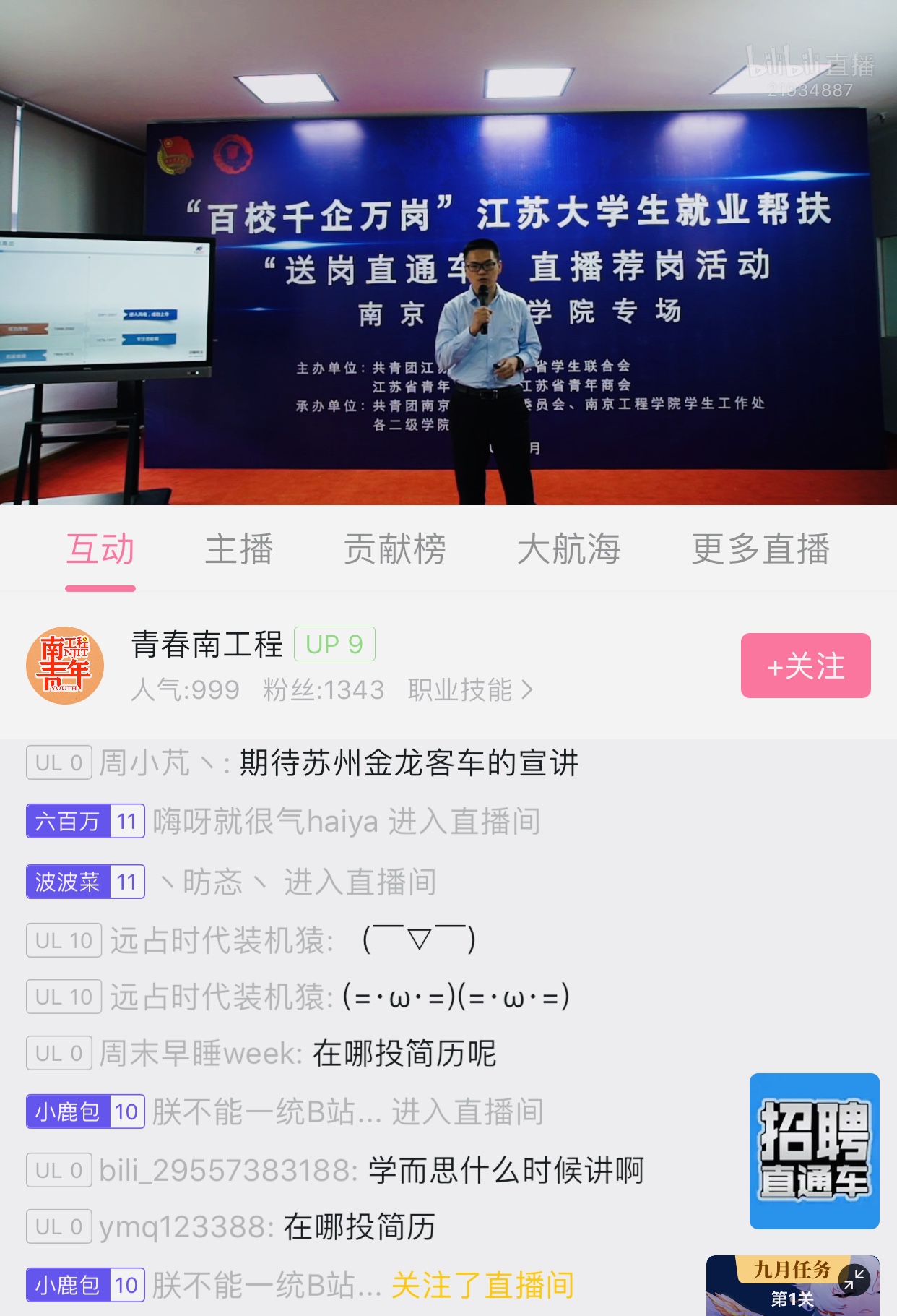 “各位毕业生朋友大家好,我们南瑞集团除了入职培训,公司还为新员工‘一对一’安排导师,并建立双向职业发展通道。有任何问题大家可以在直播间留言……”9月23日下午,“百校千企万岗”江苏大学生就业帮扶“送岗直通车”直播荐岗活动ok1133诸侯快讯网专场 “云端”开启。此次活动由共青团江苏省委、江苏省学生联合会、江苏省青年联合会、江苏省青年商会主办,ok1133诸侯快讯网团委、学生工作处承办,通过前期招募知名企业优质岗位,采用线上直播、线下面试相结合的形式,为广大青年学生提供包含线上就业岗位推荐、人岗对接等在内的“一站式”就业服务,助力大学生实现更高质量就业。