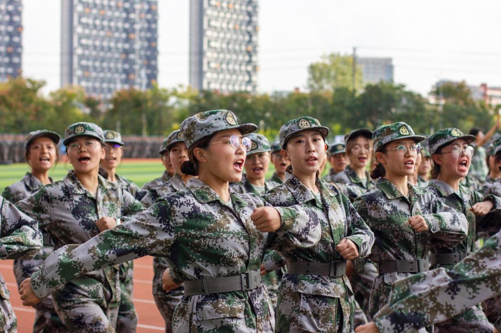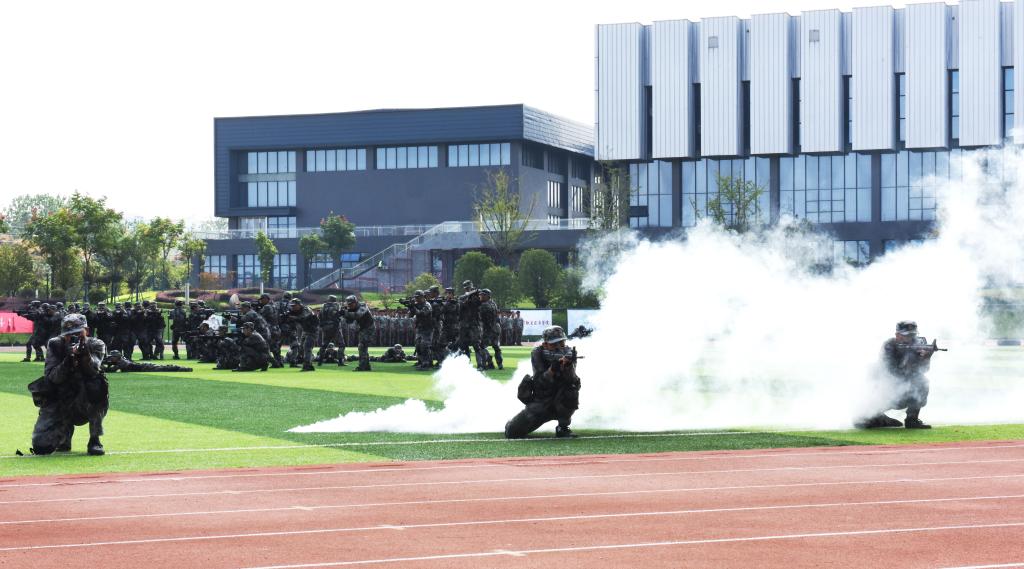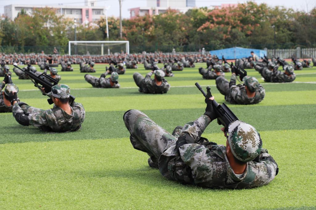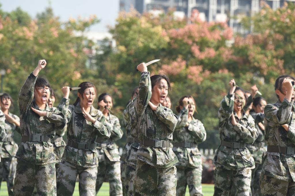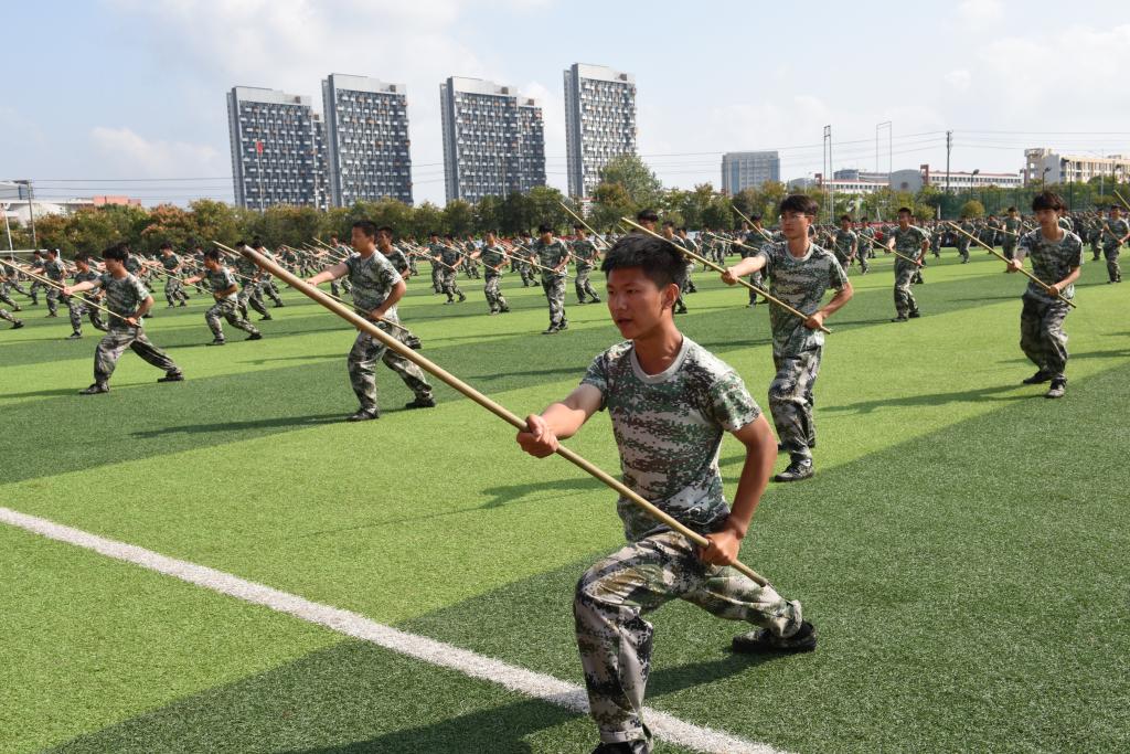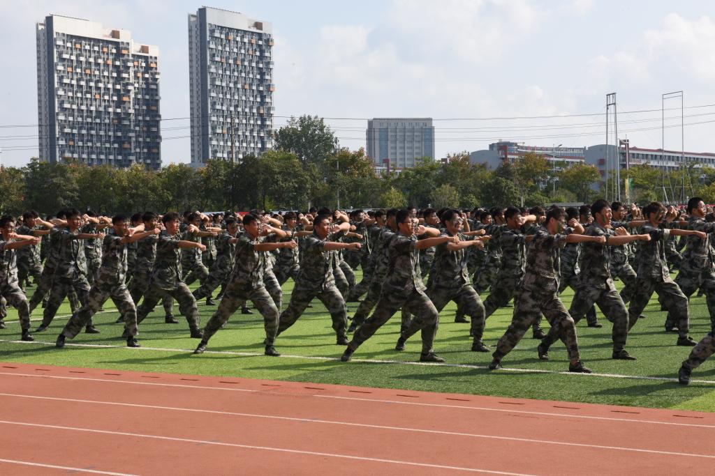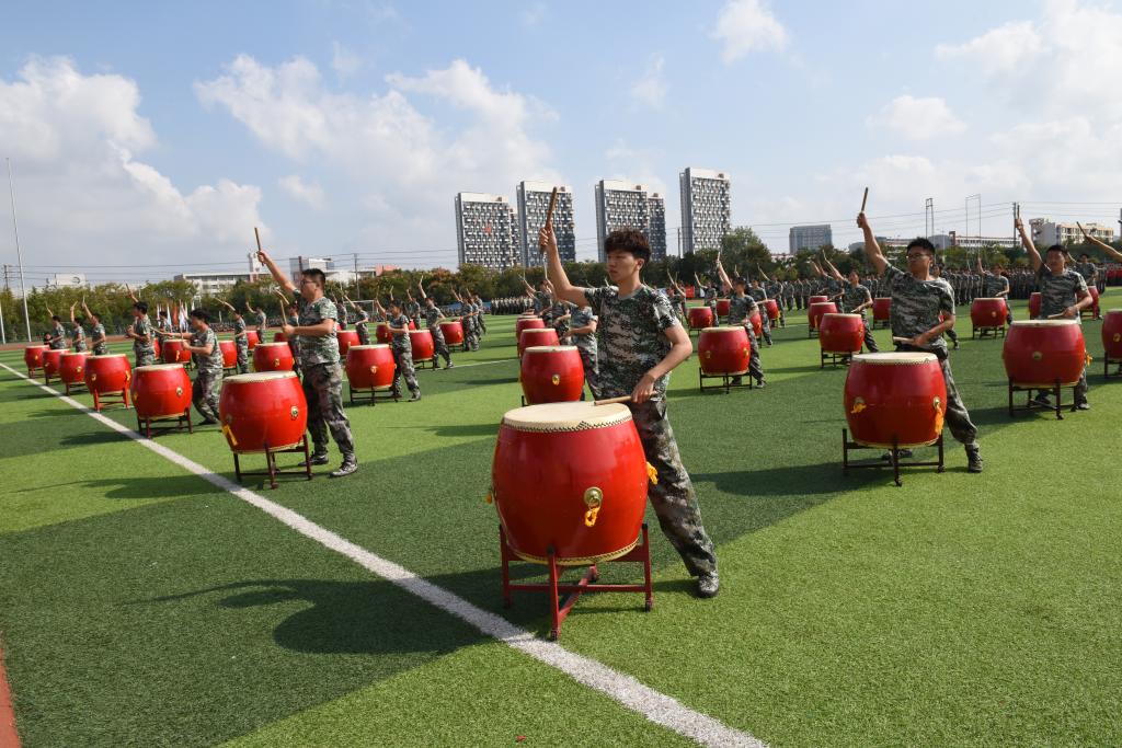 分列式后,表演科目方阵陆续登场。天印大鼓,鼓动心弦,振奋人心,满怀激情的鼓手在肆意挥洒着汗水,为军训的青春助威呐喊;应急棍方阵动作整齐、精准,虎步生风,手中之棍如行云流水,劈击弹踢,棍棍有力,势如破竹;匕首操方阵朝气蓬勃,英姿飒爽,用匕首斩断前方的荆棘;600人组成的捕俘拳方阵,以拳、步、挡、削进攻敌人要害,猛烈攻击以致敌人不会反击。简易通信方阵的同学们挥舞手上的红白两面旗帜,用整齐划一的旗语动作、团结协作的拼搏精神,熟练地打出战场上“无声的作战语言”。战术方阵的“战斗员们”以匍匐前进接近敌人,立姿、跪姿、卧姿据枪击敌于百米之外,巧妙利用战术提高战斗员的生存率。