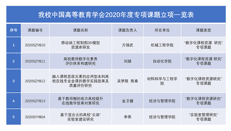 学校在课题申报组织过程中,紧紧围绕课题指南和高等教育改革热点,立足校本校情,积极宣传发动,严把课题申报质量关,确保课题申报质量和水平。其中“数字化课程资源研究”专项课题主要围绕应用型本科教育,探究在线教学资源库研发与应用,构建教师数字化素养评价体系,打造融入课程思政元素的线上金课,着重解决保障人才培养过程有效度的现实问题,提升在线教学学习效果,提高应用型人才培养质量。