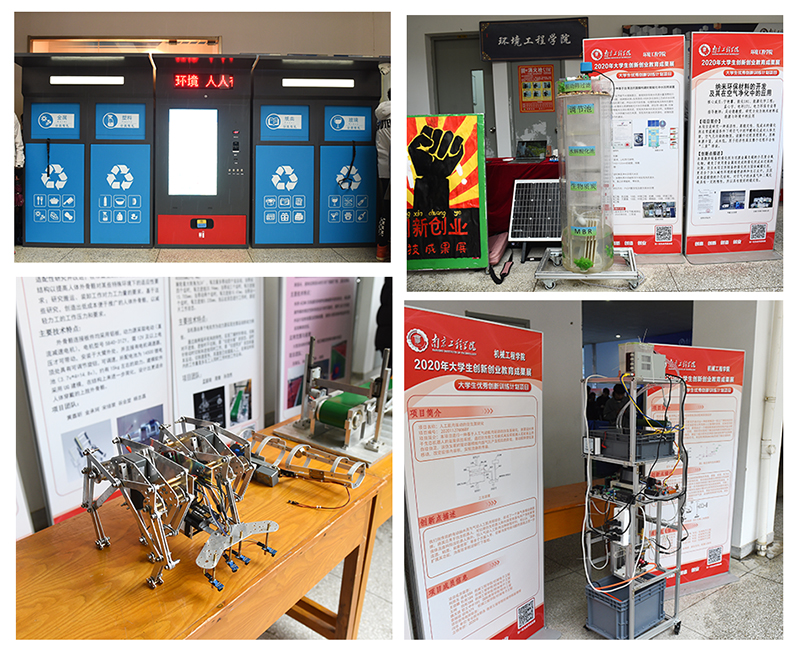 今年的主会场共展出优秀创新训练计划项目97项,优秀创业项目18项,优秀论文55篇;优秀创新创业导师58人,优秀创新创业导师团队9个。主会场还特别展示了水下机器人、机器狗、越野机器人、智能服务机器人、擂台机器人、电子设计竞赛作品等创新创业作品。展会期间,虽然冬雨不断,但师生们前来观展的热情不减,时不时看到观众与实物展示的团队进行热烈交流,对作品表现出浓厚的兴趣。由汽车与轨道交通学院选送的《一种小排量微型运动汽车设计与制造》作品具有轻量化、小排量等特点,且有更高的悬架响应速度,提高整车运动性与操控性;自动化学院选送的《基于ADABOOST级联器和UWB的察打一体四旋翼无人机》作品,不仅可以实现无人机厘米级定位,还可准确鉴别敌我双方方位,对指定目标进行主动打击。艺术与设计学院选送的《全媒体语境下剪纸文化的演变与艺术呈现研究-以扬州剪纸图式仿绘画为例》作品,运用视觉、听觉、触觉的感观方式来呈现一个全新的剪纸世界,将剪纸元素进行提炼加工,创造出一个三维世界的剪纸空间,让人们感受中国剪纸文化的魅力。计算机工程学院选送的《康复守护者:保护患者康复过程中免受二次伤害》作品,采用最先进的检测识别算法—AlphaPose,识别人体关键位置,利用SVM模型,对监测区域实现人体动态、疼痛表情实时识别,发出预警,对病患者起到全方位保护作用。先进的理念和技术、新颖的展示素材,丰富的内容及成果,获得观展师生频频点赞。