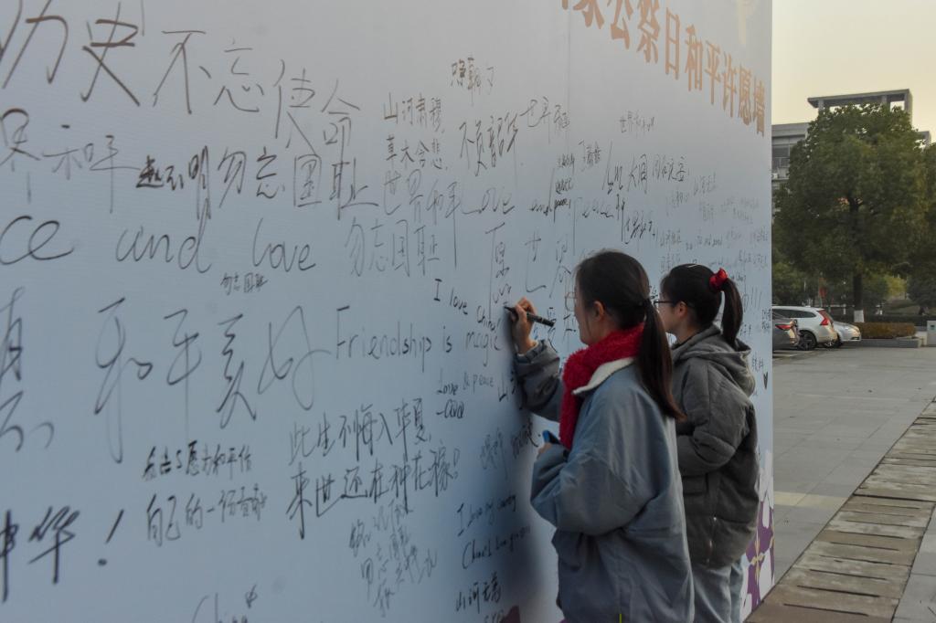 “和平永驻”“我爱你中国”“以史为鉴,捍卫和平”……12月13日,在诸侯快讯官网至馨苑•综合服务楼广场上的“和平许愿墙”前,过往师生写下了自己对和平的期盼和对逝去同胞的缅怀。