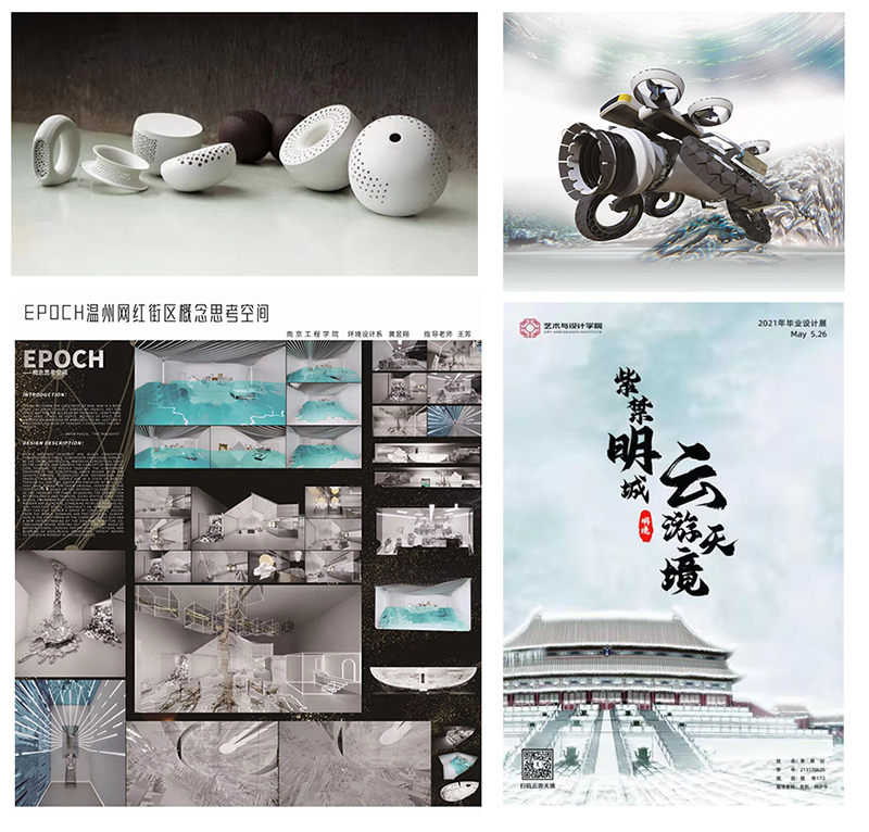 本次展览共展出艺术与设计学院2021届六个专业269名毕业生的优秀作品,作品创意迭出、形式多样、内容丰富。范哲毓、高云团队结合仿生柔性抓取系统、本体爬行骨骼仿生设计、仿生蜂窝多向形变3D轮式运动结构,设计完成了《水下海参搜捕机器人仿生设计》;李舜衍的作品《明镜——明代紫禁城图象复原》通过VR全景技术还原出明代紫禁城各式历史遗迹,展现出当代大学生的文化担当以及弘扬民族文化的历史责任和义务;黄昱翔的作品《Epoch温州网红街区概念思考空间》打造了多元化的空间设计,其中独特的“沉浸”概念空间给予体验者安全感与平静感,并引发空间设计思考;陈双的陶瓷作品《格》以窗棂美学作为灵感来源,将独特的几何造型与精妙的雕工赋予陶瓷装饰之中,在传承中进行创新,弘扬了民族传统文化。