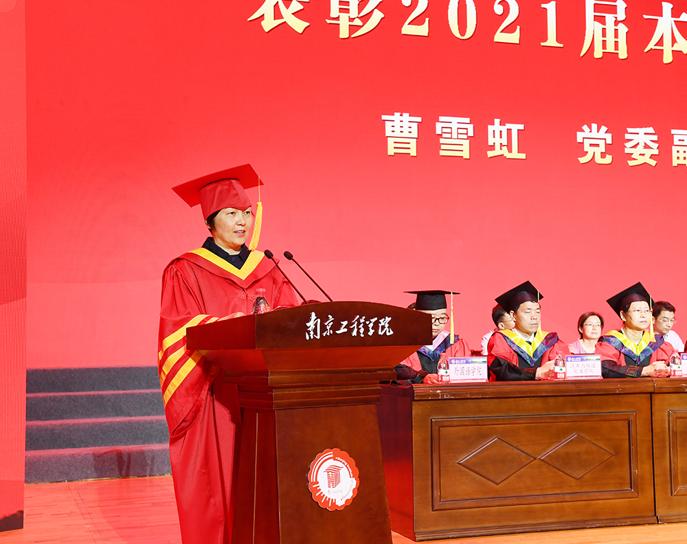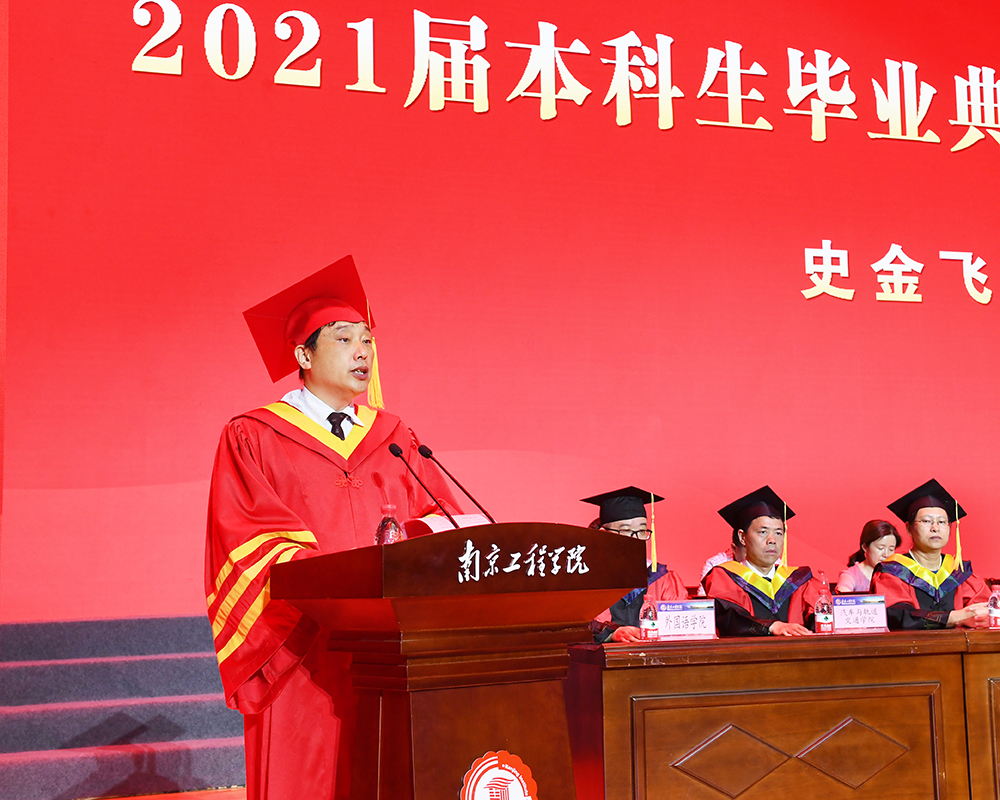 毕业典礼上,校党委副书记、院长史金飞代表学校深情寄语全体毕业生。史金飞院长说,四年来,天印湖畔、方山脚下处处留下了同学们辛勤的汗水、奋斗的足迹和激扬的青春豪情,大家取得的成绩是全体教职工辛勤耕耘、精心育人的结果,是各位家长亲切关怀、鼓励支持的结果,更是同学们自强不息、勤奋努力完成的一份份优秀答卷。四年来,同学们与学校共同成长,见证了学校发展的点点滴滴,学校的发展与进步都凝聚着同学们贡献的青春智慧与无限活力,是一代代南工程人凝聚智慧、共同奋斗、无私奉献的结果。