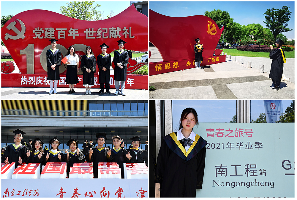 今年毕业季恰逢建党百年,校园氛围更加隆重热烈。会场外,“庆祝中国共产党成立一百周年”大型展架、“奋斗百年路,启航新征程”台阶贴画与“到祖国最需要的地方去”“未来可期”“南工程校徽”“毕业车票”等造型与字样营造了浓郁的爱党爱国爱校氛围,吸引了众多毕业生前来合影。