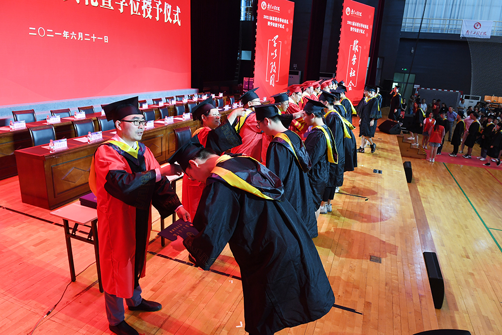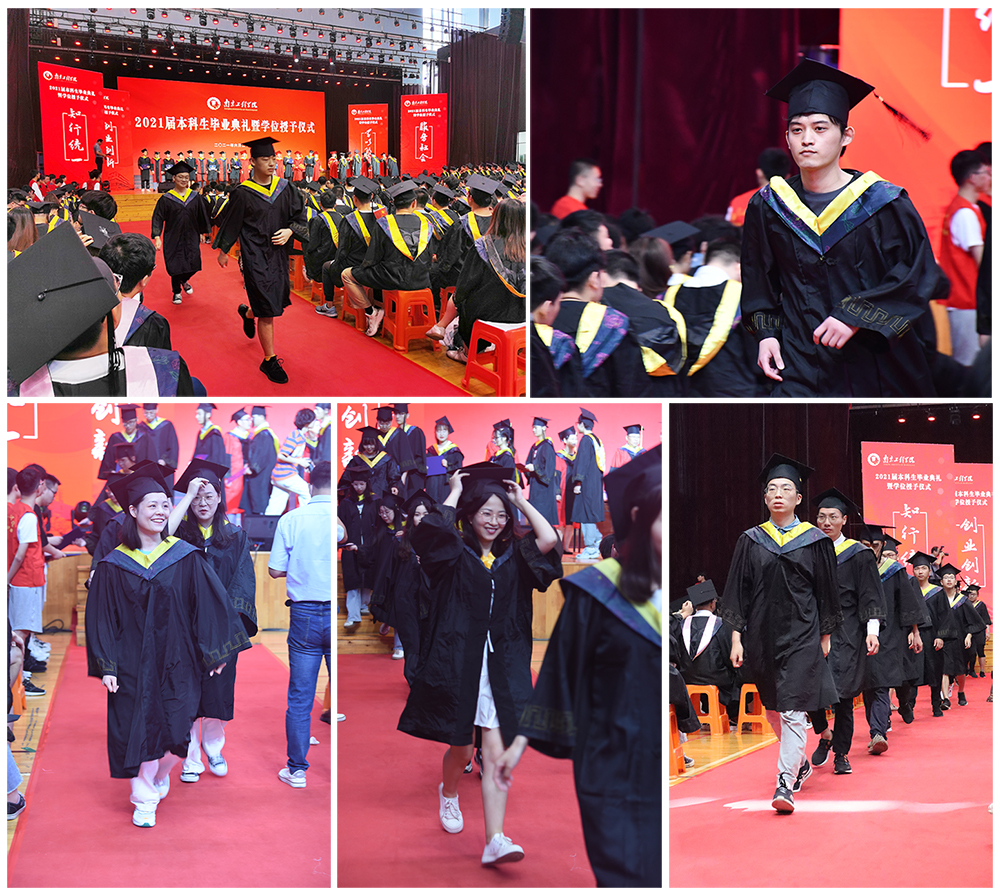 会场内,鲜艳的国旗、写满毕业祝福语的旗帜、大红的LED大屏、大红的地毯、循环播放的2021年南工程毕业歌……所有的精心装扮都是对同学们圆满完成学业的浓浓祝福,也是对他们即将开启人生新篇章的深情嘱托。“很荣幸自己的人生重要时刻遇上了我们党的百年华诞,”中共党员、网络工程171班林情同学激动地说:“祖国进入新时代,我们也踏上新征程,作为青年一代理当用不懈拼搏奏响青春之歌,以奋斗姿态拥抱青春梦想。”“临近离别,却越是不舍。”今年毕业歌主创之一、材料172班毕业生沈嘉鹏告诉记者:“这首歌送给毕业的自己,也送给2021届小伙伴们,希望母校越来越好,希望毕业生们前程似锦,希望学弟学妹不负韶华,越努力,越幸福。”典礼结束后,毕业生们纷纷与师长和同窗彼此拥抱和祝福,并合影留恋,依依不舍之情溢于言表。