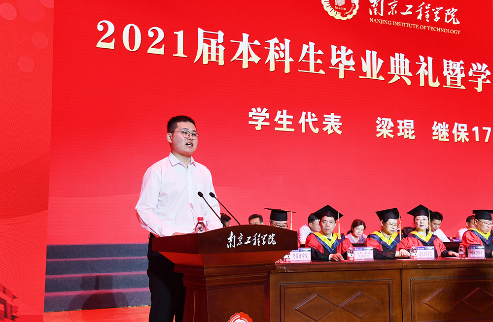 电力工程学院继保172班梁琨同学代表全体毕业生向精心培育自己的母校和老师、辛勤操劳的父母以及朝夕相处的同窗表达了衷心的感谢。“难忘天印湖畔,鹭鸟相伴,图书馆里,埋头奋战。”他说此次别离,大家定会带着母校师长的祝福和期望,铭记“学以致用”的校训和“知行统一,创业创新”的校园精神,用扎实的业绩为祖国母亲和亲爱的母校献礼!