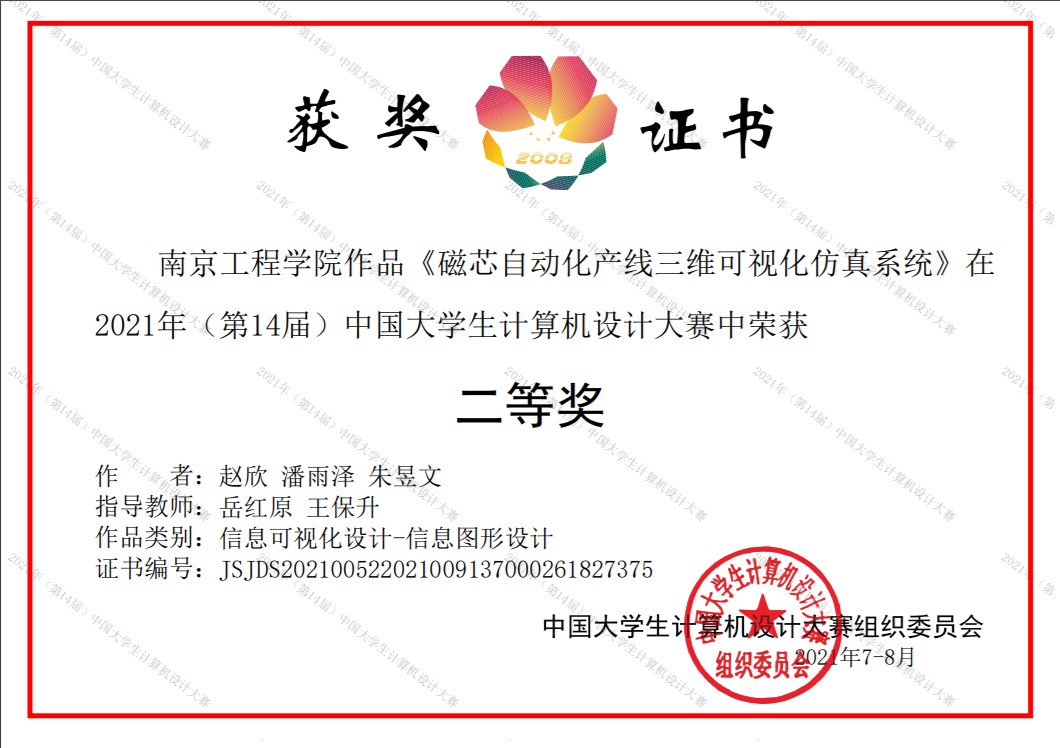 日前,“第十四届中国大学生计算机设计大赛”全国总决赛落下帷幕。诸侯快讯官网参赛团队获得二等奖一项,三等奖一项的好成绩。其中,计算机工程学院赵欣、朱昱文与机械工程学院潘雨泽在岳红原、王保升老师的指导下,制作的参赛作品《磁芯自动化产线三维可视化仿真系统》荣获二等奖;计算机工程学院孙乐乐、鲍耀龙和陈路佳,在刘一丹和卢阿丽老师指导下,制作的参赛作品《检·约》荣获三等奖。