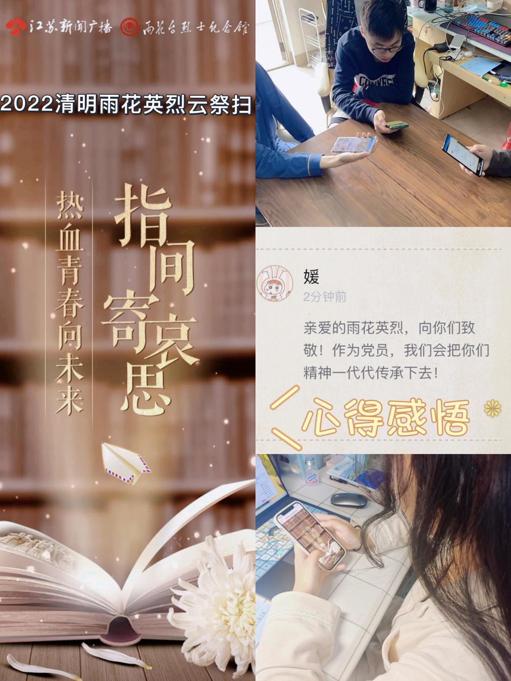 清明,是缅怀,更是纪念。早上9:00,同学们便满怀着敬意,参加由江苏省广播电视总台融媒体新闻中心、江苏新闻广播等媒体与雨花台烈士纪念馆共同推出的《热血青春向未来——2022清明雨花英烈云祭扫》活动。他们或端坐在书桌前,用书信满载缅怀;或徜徉于校园里,以春风寄托思念。于缅怀中汲取力量,于纪念中坚定担当。一张张发黄的照片、一件件变旧的遗物、一个个动人的故事……革命先烈辉煌的战斗历程震撼着每一颗年轻澎湃的心,也坚定着每一个奋斗前进的步伐。“云祭扫”吸引了很多同学打卡、留言、在线祭奠、遥寄哀思,不少同学被雨花英烈的事迹和精神所感动,情不自禁地流下眼泪。