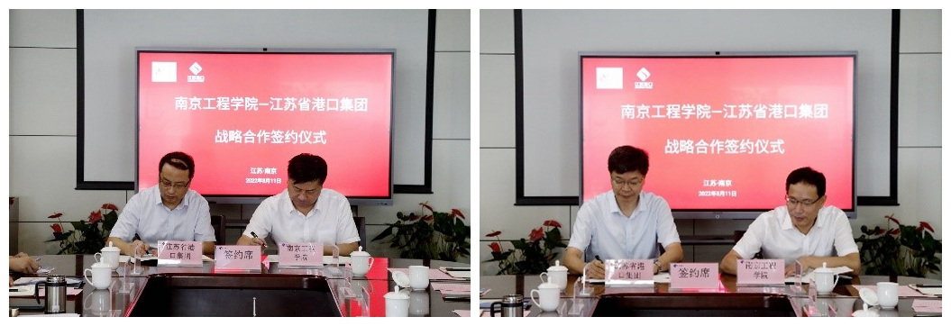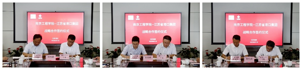 在与会人员的共同见证下,副院长朱晓春、张仰飞分别代表学校与江苏省港口集团签订了全面战略合作协议与校企人才培养合作协议;机械工程学院、自动化学院、信息与通信工程学院负责人分别与南京港机重工制造有限公司、江苏苏港智能装备产业创新中心有限公司、江苏省港口集团信息科技公司签署产学研合作协议。