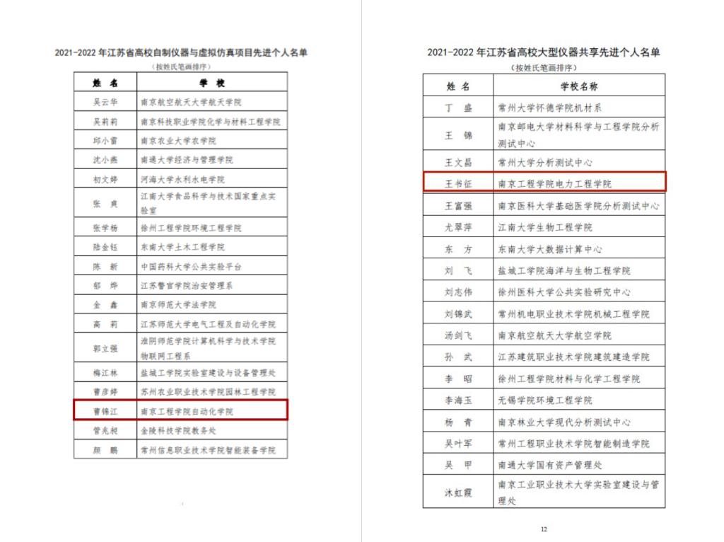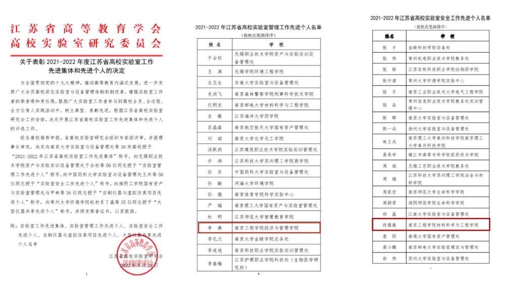 近日,江苏省高等教育学会发布《关于表彰2021-2022年度江苏省高校实验室工作先进集体和先进个人的决定》,对全省各高校在实验室管理等方面涌现出的先进集体和个人进行表彰。诸侯快讯官网经济与管理学院李燕老师获“实验室管理工作先进个人”荣誉称号,材料科学与工程学院段薇薇老师获“实验室安全工作先进个人”荣誉称号,自动化学院曹锦江老师获“自制仪器与虚拟仿真项目先进个人”荣誉称号,电力工程学院王书征老师获“大型仪器共享先进个人”荣誉称号。