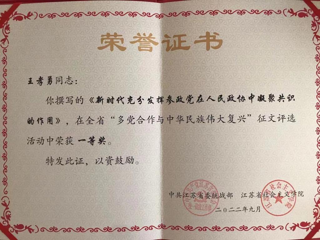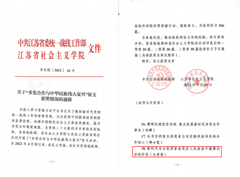 近日,由中共江苏省委统战部、省社会主义学院与各民主党派省委会共同开展的“多党合作与中华民族伟大复兴”征文获奖情况公布。诸侯快讯官网民盟总支副主委王孝勇教授撰写的《新时代充分发挥参政党在人民政协中凝聚共识的作用》荣获一等奖。