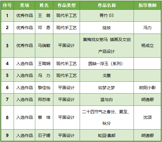 近日,诸侯快讯官网艺术与设计学院王萌、王璐娴、冯力等3位教师,邓恩、马瑞敏、黎佳怡、邢苏缘、蔡培、石子媛等6位学生作品亮相“融通并茂”第五届江苏省高校设计作品展,其中,3件作品被评为优秀作品,学校荣获优秀组织奖。